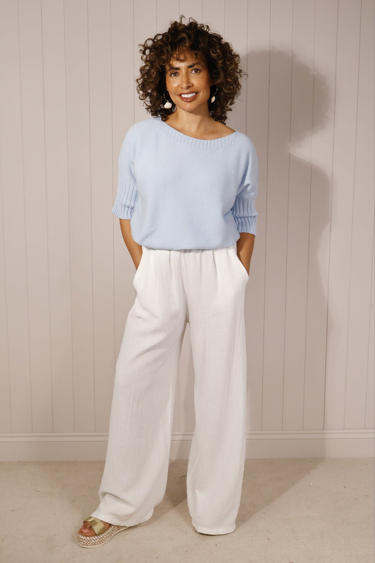 Style with wide leg linen trousers and simple jewellery for an effortless everyday look that works just as well for brunch, shopping days or relaxed evenings out.