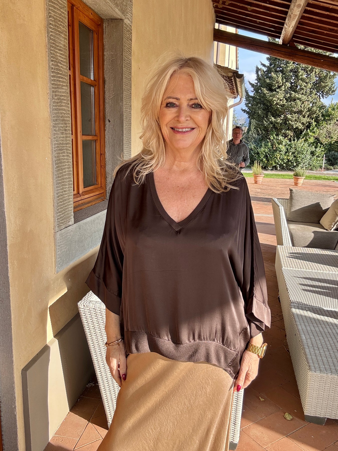 Soft, floaty and effortlessly elegant, the Orient Silky V-Neck Top is crafted in Italy from beautifully lightweight viscose with a subtle silky sheen. Designed with a relaxed, slouchy fit, it drapes softly on the body for an easy yet polished look.