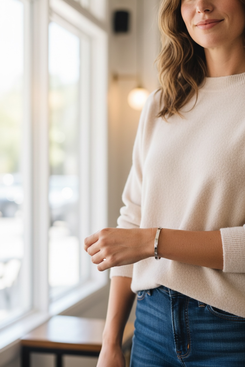 A sleek, designer inspired silver bangle featuring subtle screw style diamante detailing throughout. Minimal yet statement making, this trending bracelet adds instant polish to everyday looks and layers beautifully with your favourite wristwear.