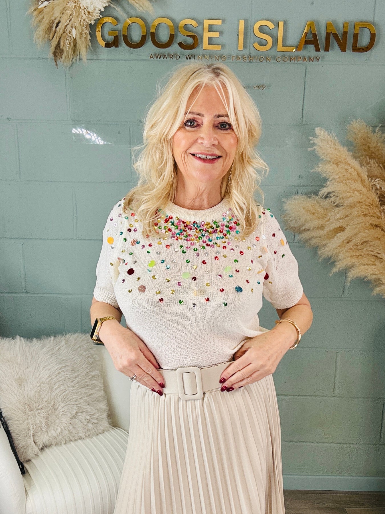 A real statement piece with a playful twist, this sequin embellished knit top adds instant sparkle to your wardrobe. Designed with a soft knit base and scattered multicolour sequins across the front, it brings colour, texture and personality while remaining easy to wear.