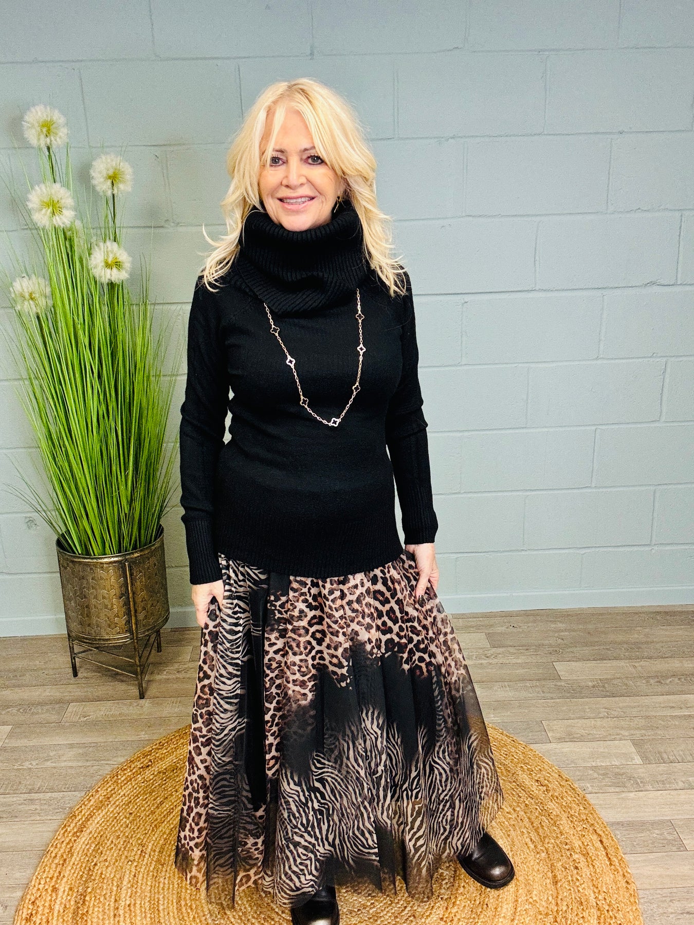 A beautifully soft longline jumper with a relaxed cowl neckline and ribbed detailing. Easy to wear and flattering on the body the perfect cosy layer for the season.