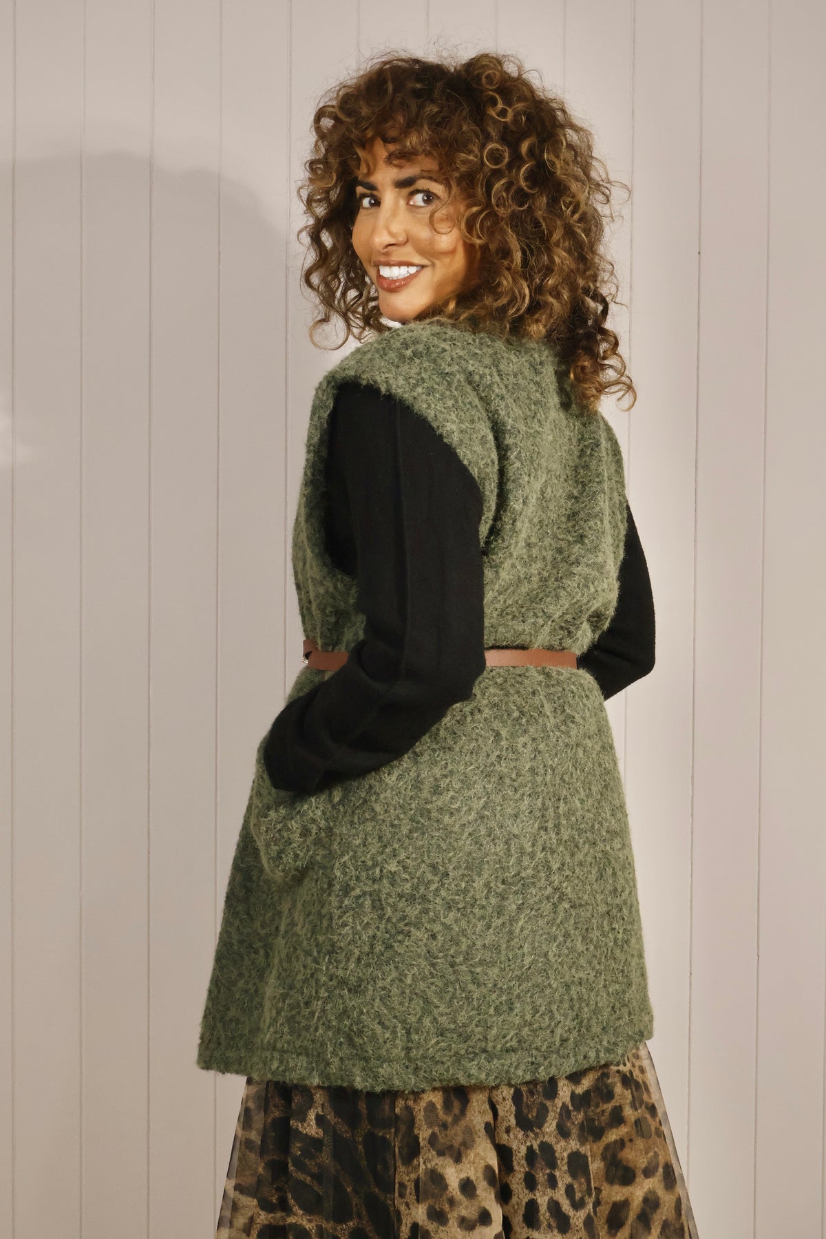 Add a layer of cosy chic with our faux fur gilet, complete with a sleek faux leather belt to cinch the waist. Made in Italy, this versatile piece is perfect over knitwear or dresses, giving you instant warmth and style for autumn and winter. Available in Khaki