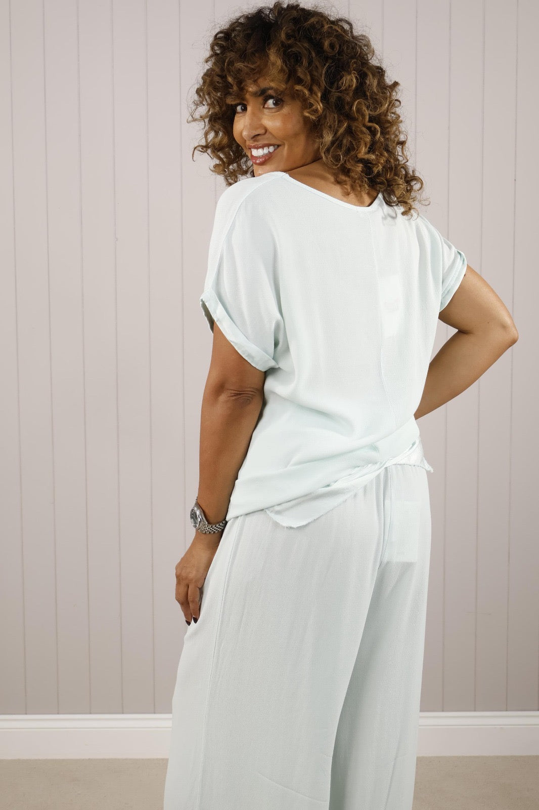 Wide leg palazzo style trousers  with satin hem and fraying detail at the bottom.