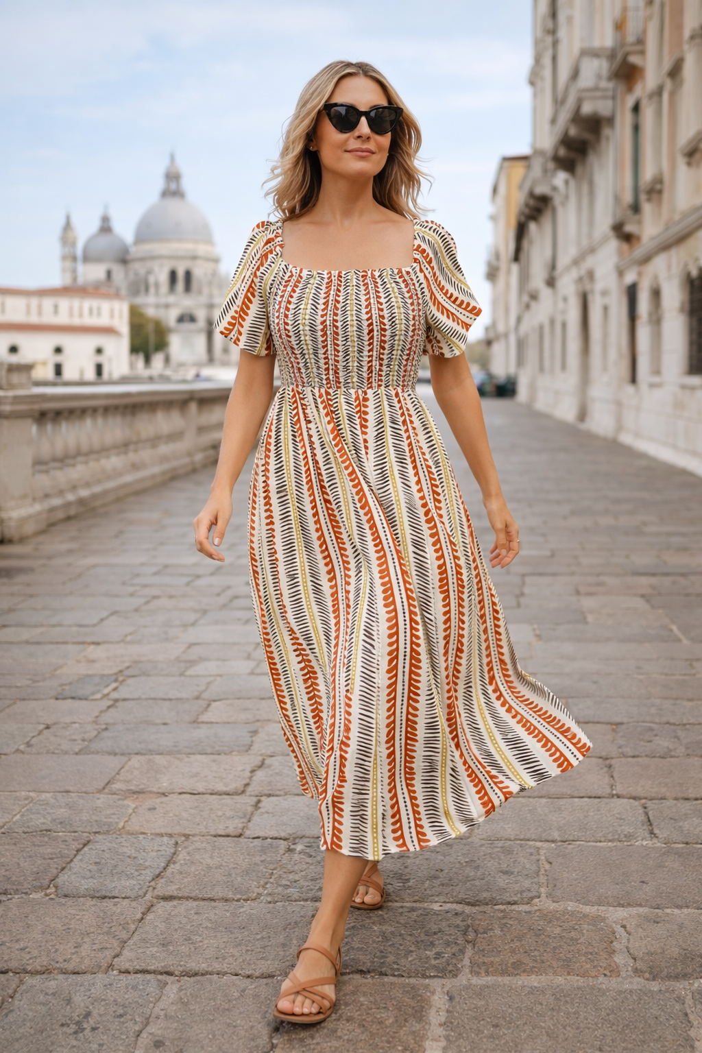 Style the Azoria Dress with strappy sandals, a woven bag, and simple gold jewellery for an effortlessly polished look.
