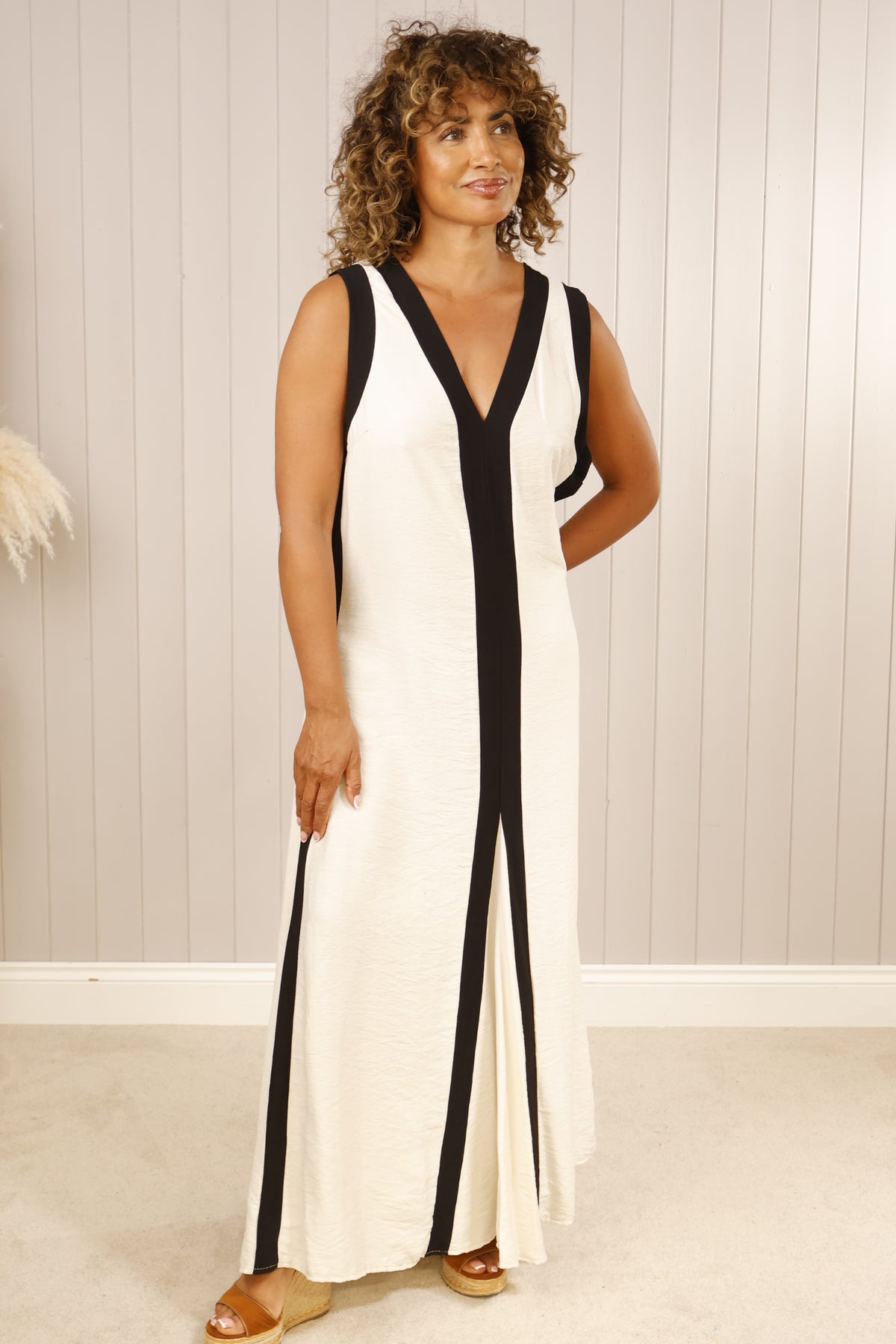 Gorgeous flattering maxi dress with V neck white strip in the front and  on the sides