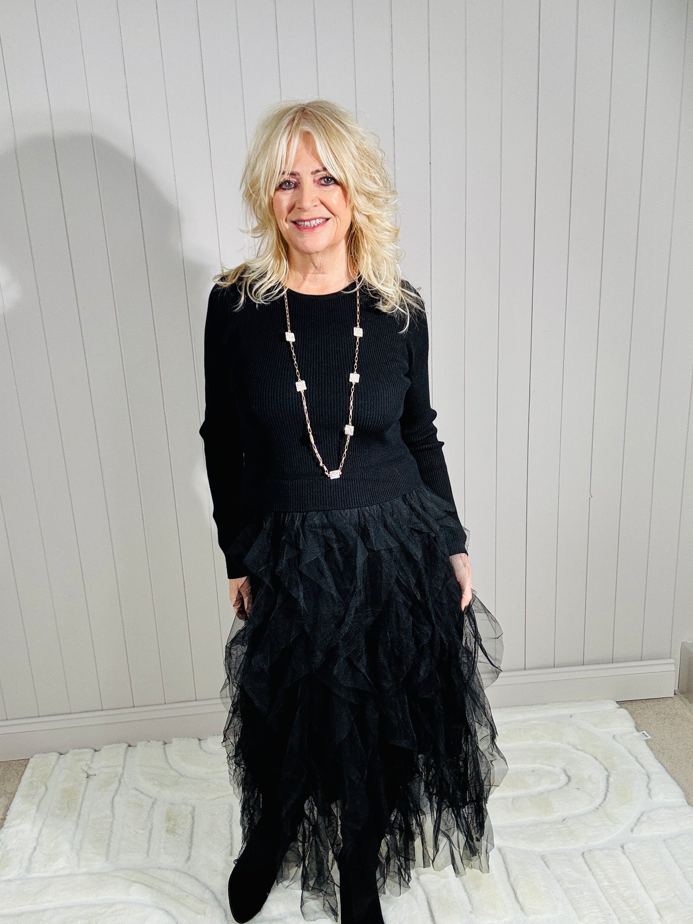 Make an entrance with the Violetta Tulle Dress – a glamorous statement piece with a hint of romance. The soft knitted top offers comfort and stretch, while the layered ruffled tulle skirt adds drama and movement for the ultimate show stopping look. Perfect for parties, festive occasions and elegant evenings out.