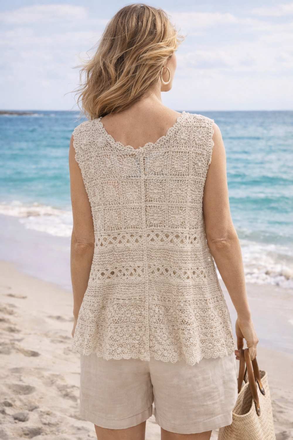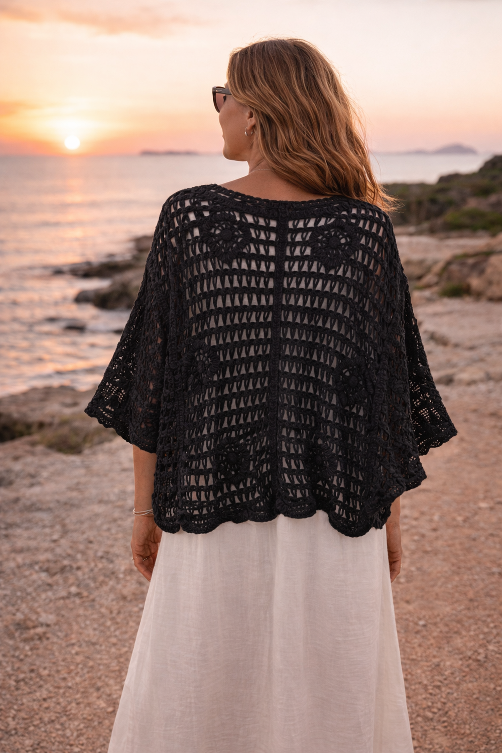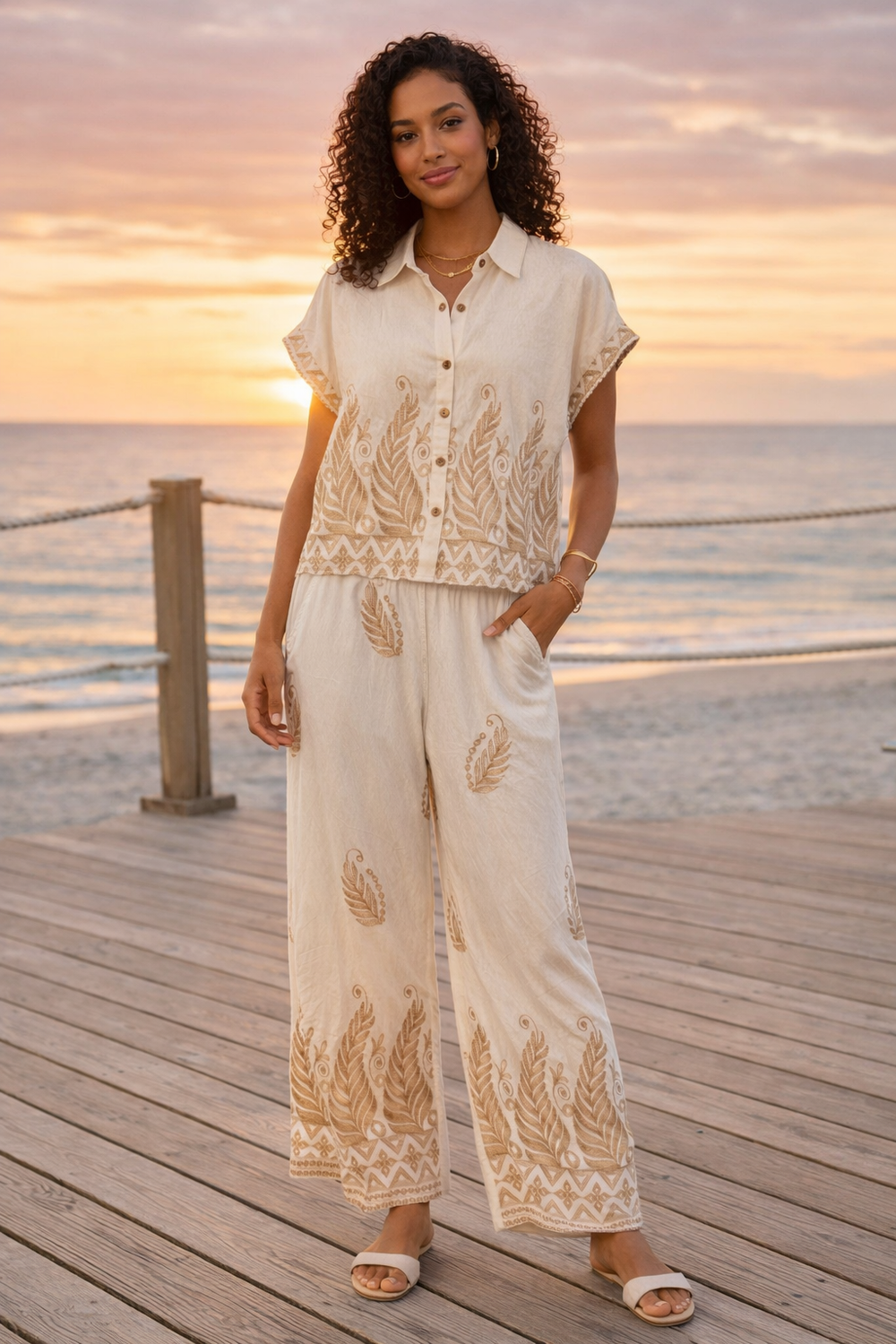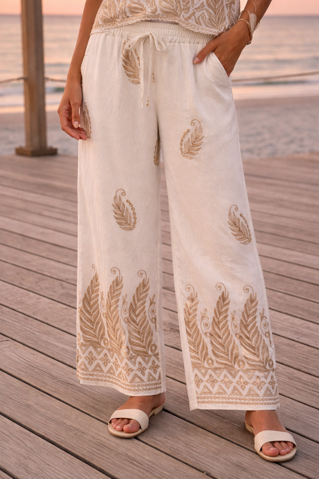 Lightweight fabrics, sequins, crochet textures, and embroidery are paired with relaxed silhouettes designed to move with you from beachside strolls to sunset gatherings. A palette of sun faded neutrals and warm sands reflects the natural beauty of coastal landscapes, designed to feel as the breeze.