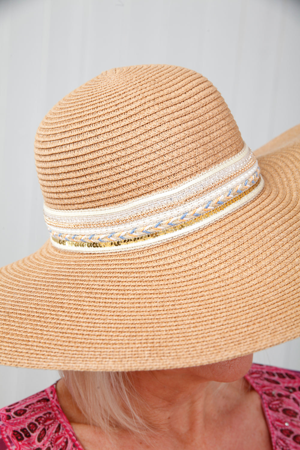 Bring effortless holiday style to every outfit with this beautifully woven straw hat. Designed with a wide brim for a chic, elegant finish, it’s trimmed with a standout embellished band featuring sequins, beading and plaited thread in soft summer shades. Lightweight and breathable, it’s the perfect finishing touch for sunny getaways, garden parties and everyday warm-weather dressing.