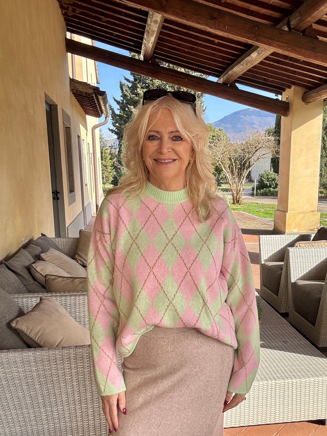 A dreamy, soft touch knit with a pretty pastel argyle pattern in baby pink and pistachio. Easy to throw on with denim, leather-look leggings or over a satin skirt.