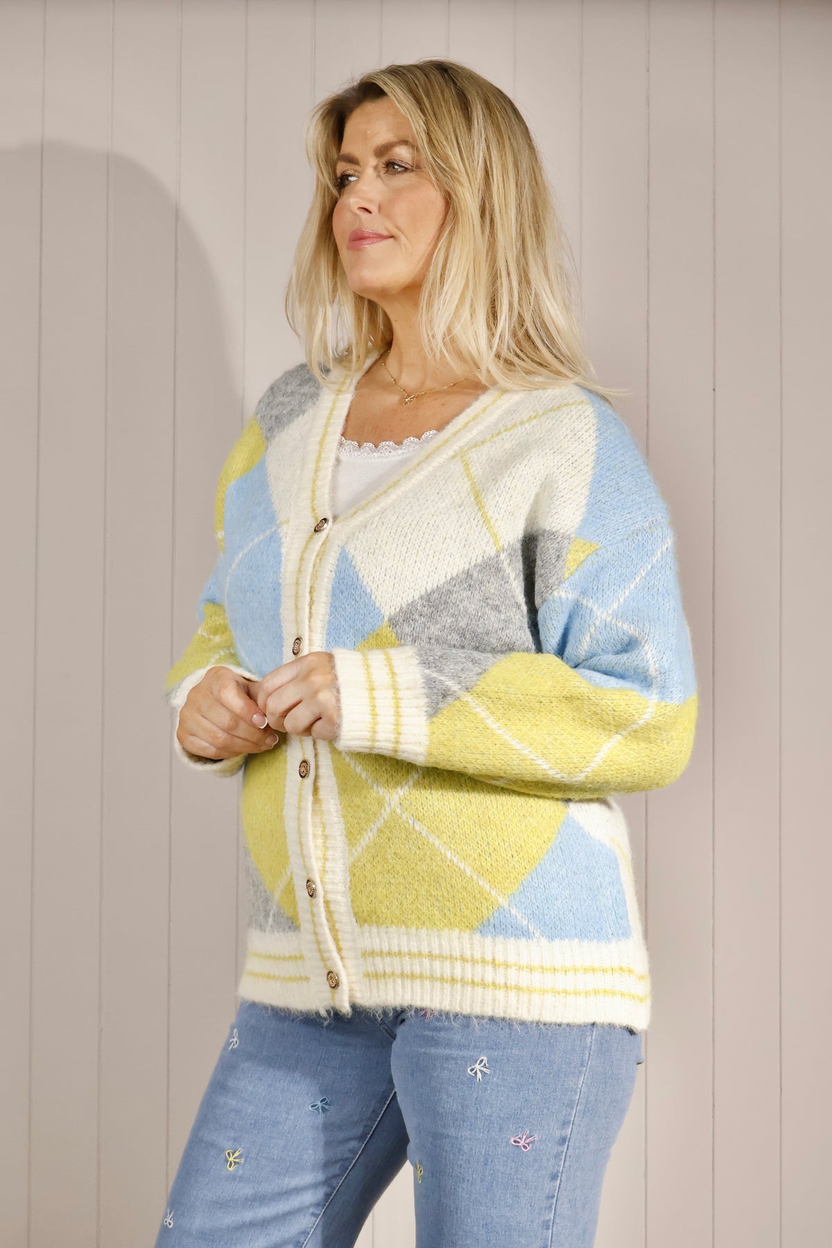 This super soft argyle cardigan is one of those effortless throw on pieces you’ll reach for again and again. Designed in a fresh mix of lime, soft blue, grey and cream, it adds a gentle pop of colour while still feeling beautifully wearable. Finished with a flattering V neckline, classic button front and cosy ribbed trims, it’s relaxed, luxe and easy to style.