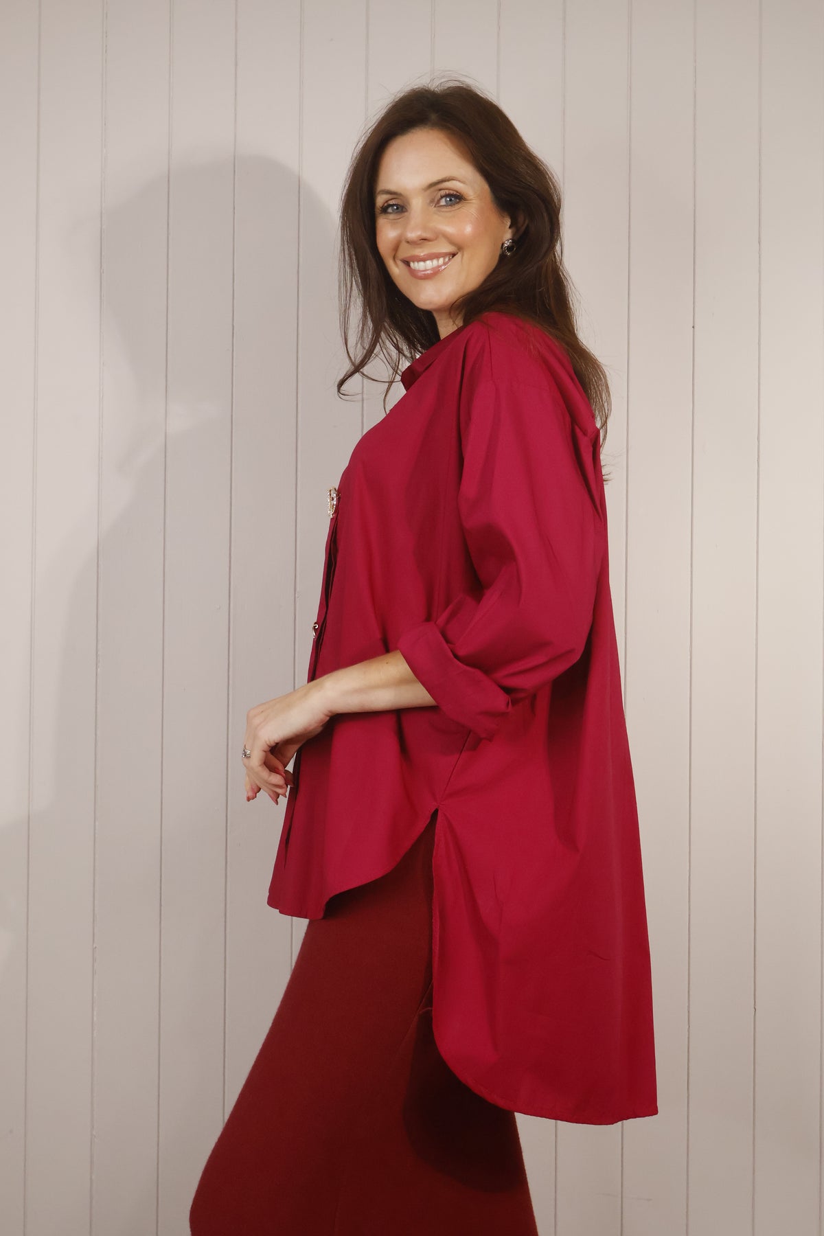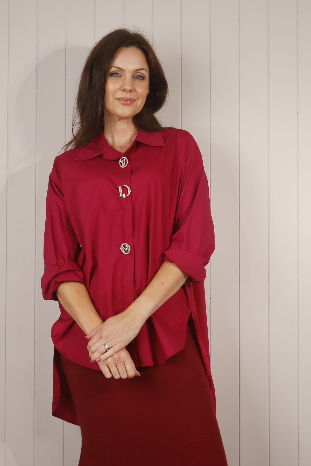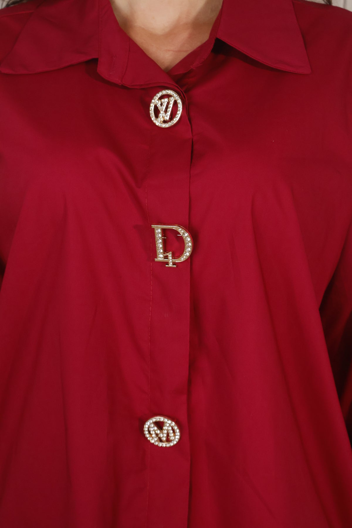 A crisp wine colouredTops shirt with a touch of glamour. Diora is a classic button-down style with regular shirt buttons through the front and cuffs, elevated with three detachable, designer-inspired brooches that come pinned on and included with the shirt. Made in Italy from a soft cotton blend, it’s an easy piece to dress up or down.