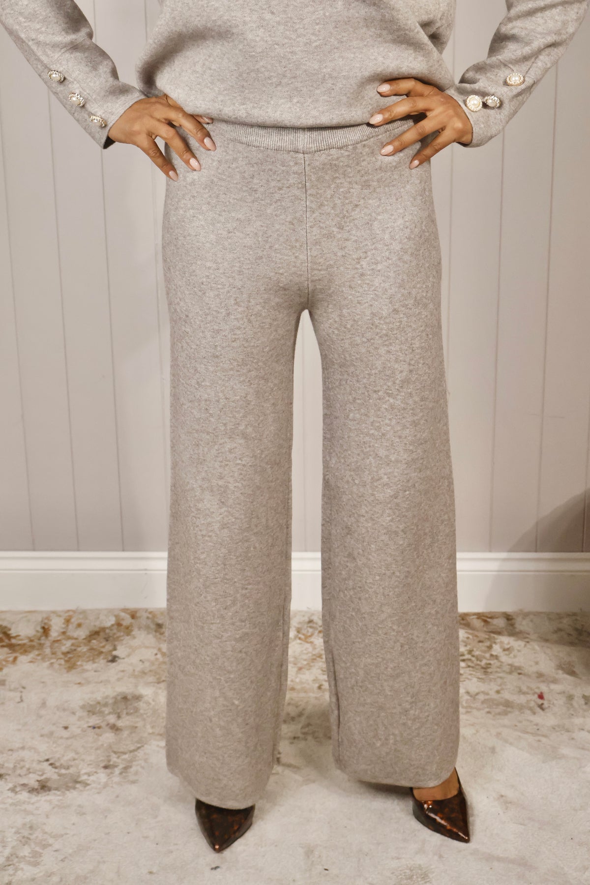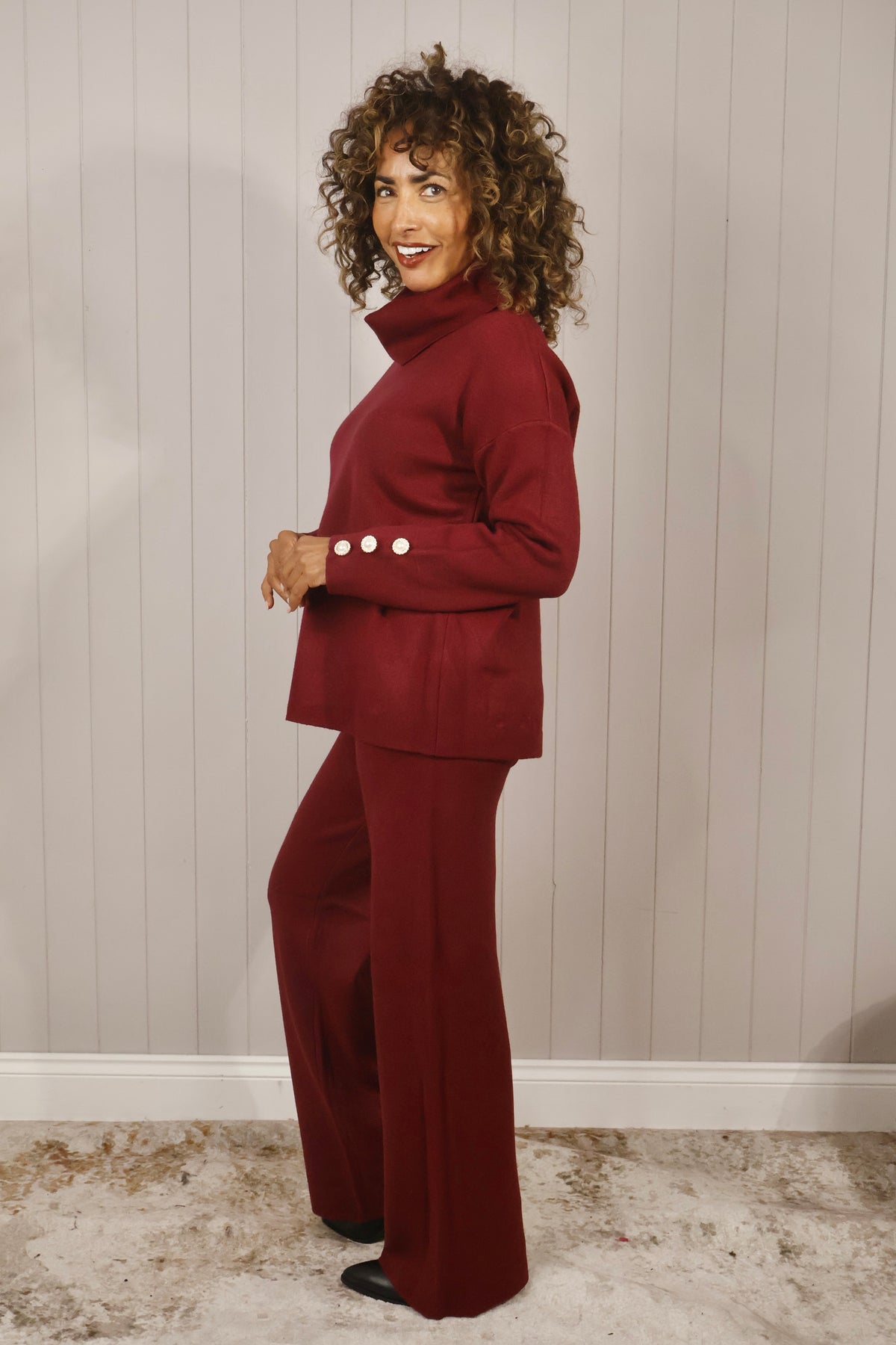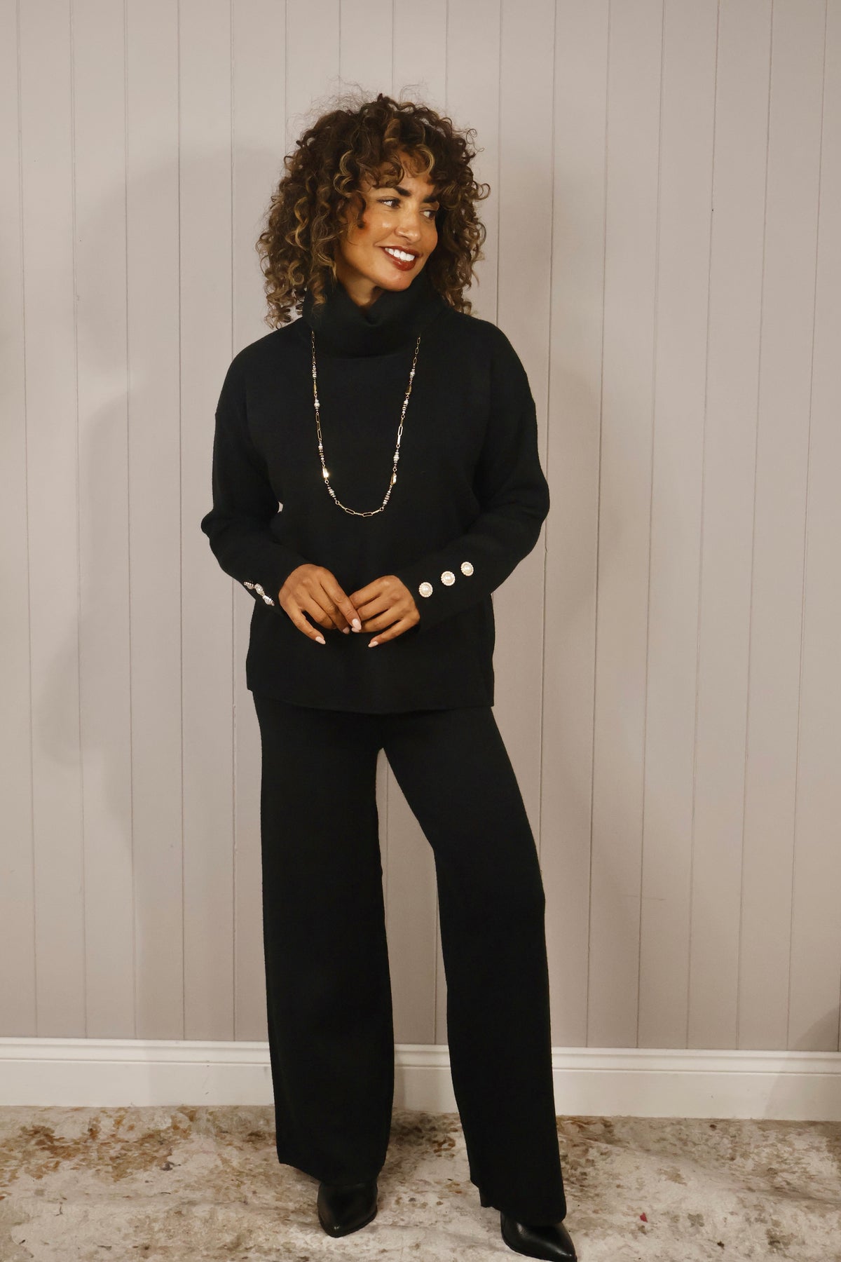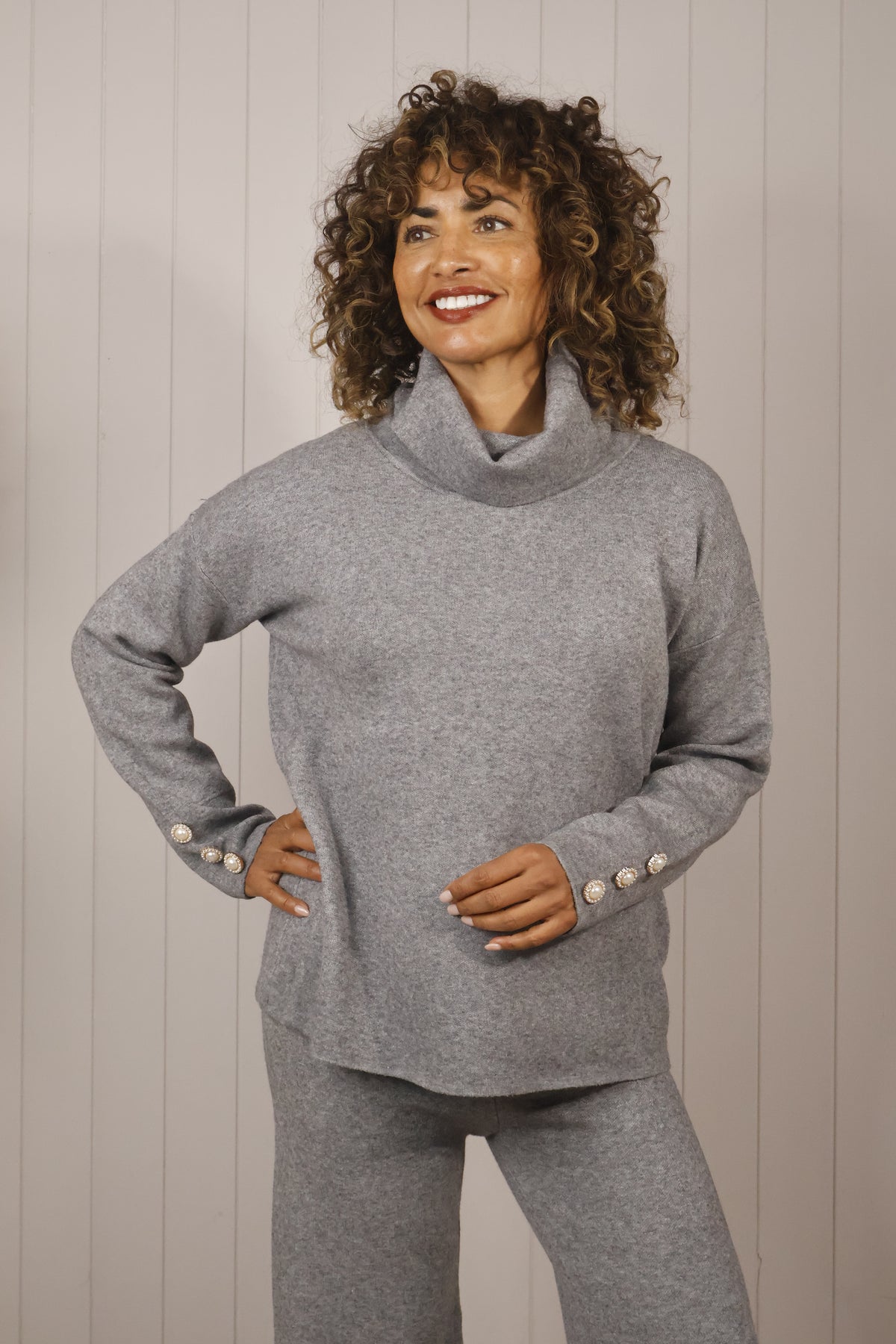 Designed in a soft knit with a relaxed cowl neck and elegant pearl button sleeve detail. The matching wide leg trousers feature a smooth elastic waistband for all day comfort. An effortlessly stylish outfit that’s perfect for brunch dates, coffee catch ups or laid back weekends.