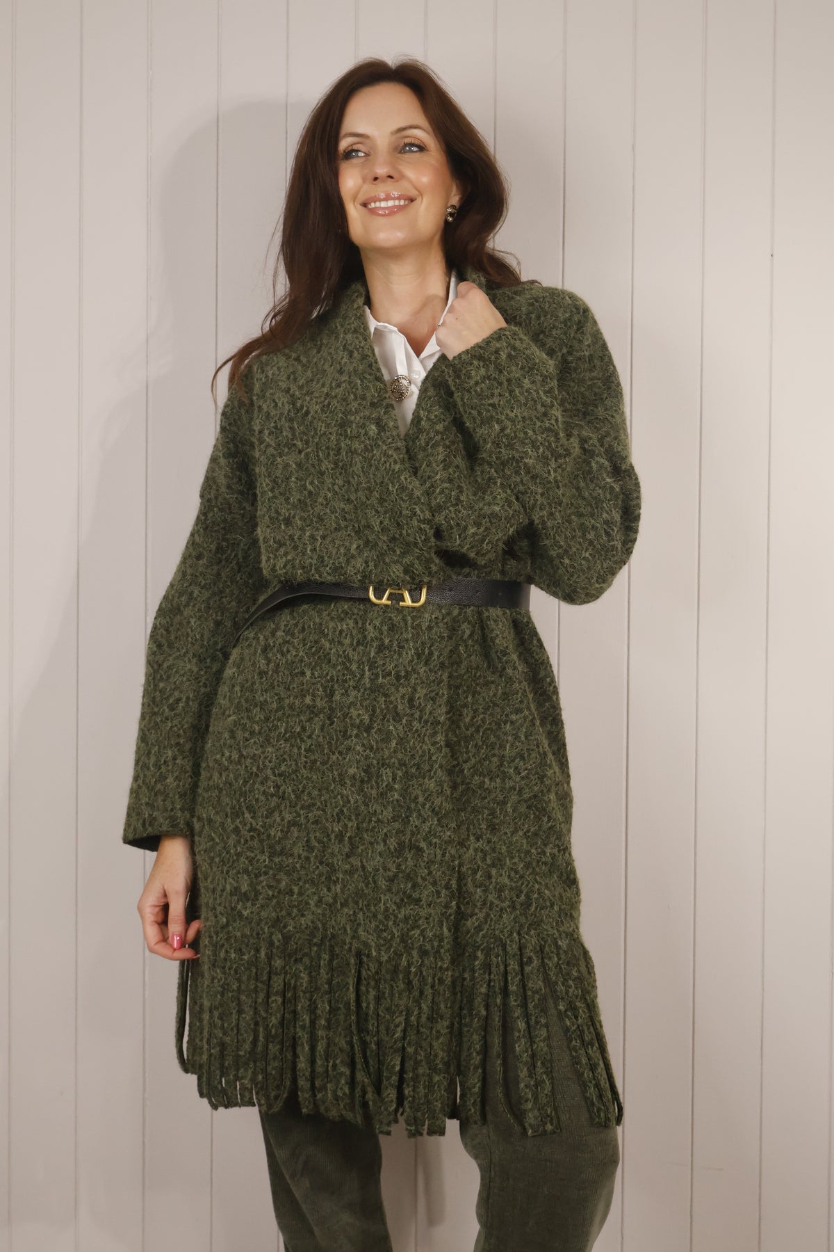 With its longline cut, fringe hem, and textured finish that resembles boiled wool (but crafted from 100% polyester for easy care), this piece is all about chic layering without the fuss.