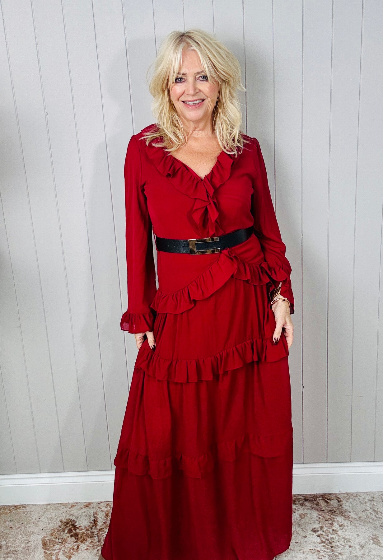 A beautifully romantic style that moves with effortless grace. The Raven Ruffle Dress features cascading ruffles through the front and sleeves, a soft floaty skirt, and a flattering v neckline. Finished with a matching black belt to cinch the waist for a chic silhouette.
