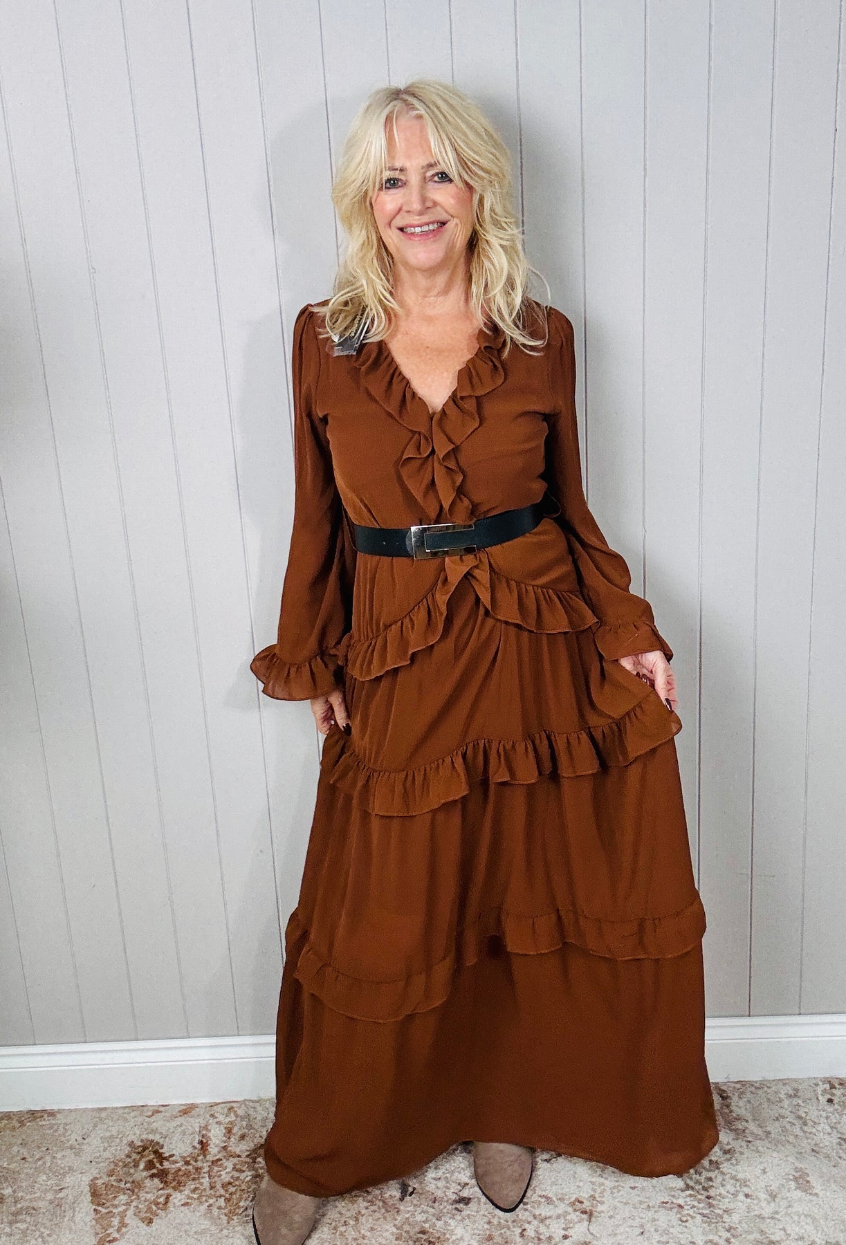 A beautifully romantic style that moves with effortless grace. The Raven Ruffle Dress features cascading ruffles through the front and sleeves, a soft floaty skirt, and a flattering v neckline. Finished with a matching black belt to cinch the waist for a chic silhouette.