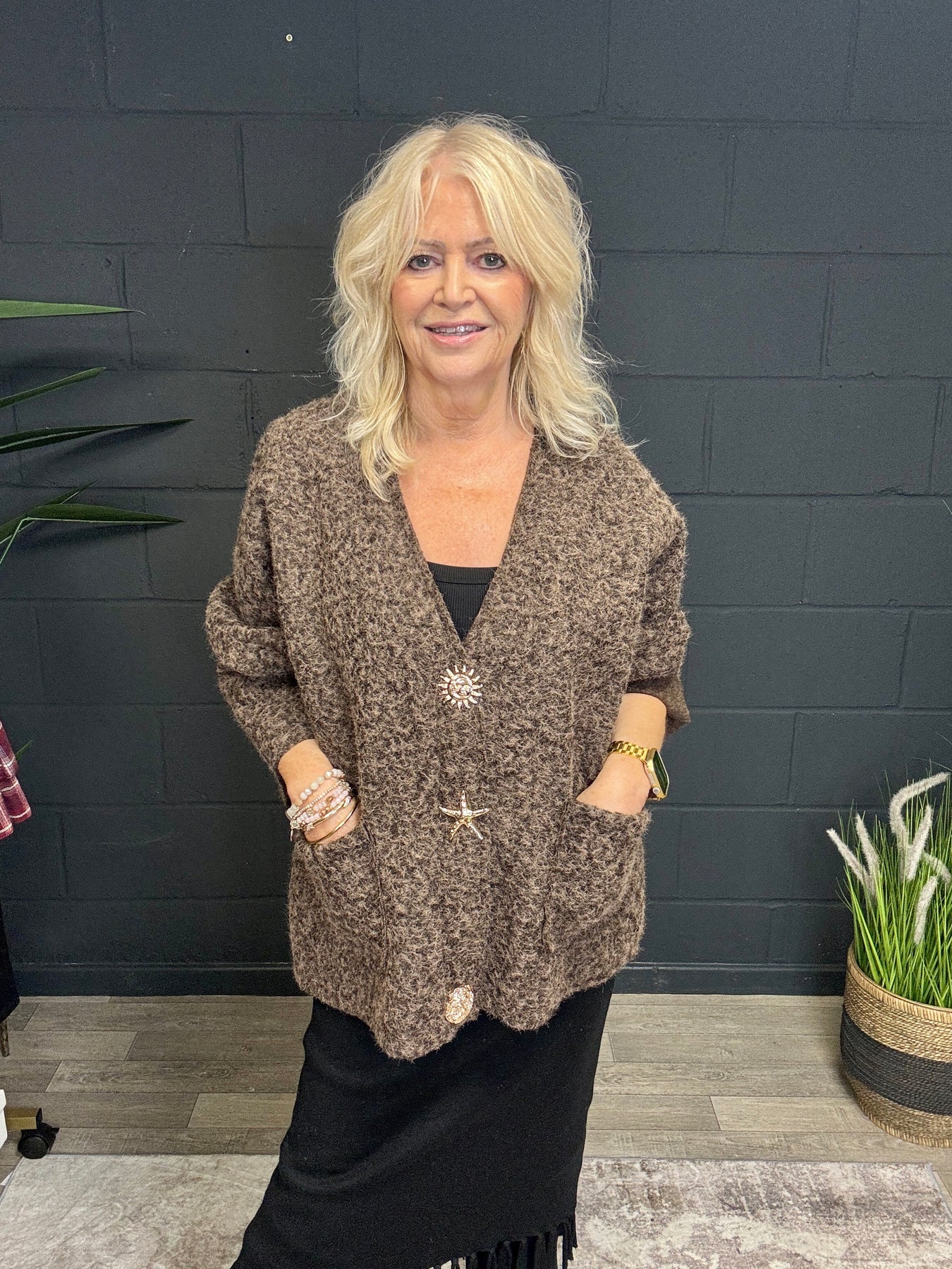 Cosy meets statement in the Sandy Brooch Jacket a textured boucle style with eye catching gold brooch style buttons that give a touch of luxe charm. Effortless to throw on, it’s cut in a relaxed fit with two deep front pockets and soft turned back cuffs. Perfect layered over black jeans or styled up with printed skirts for that chic, elevated everyday look.
