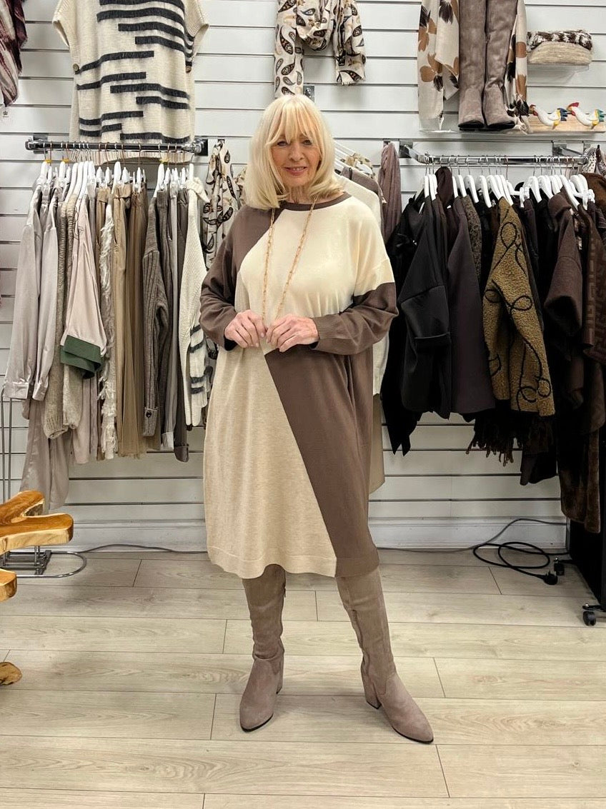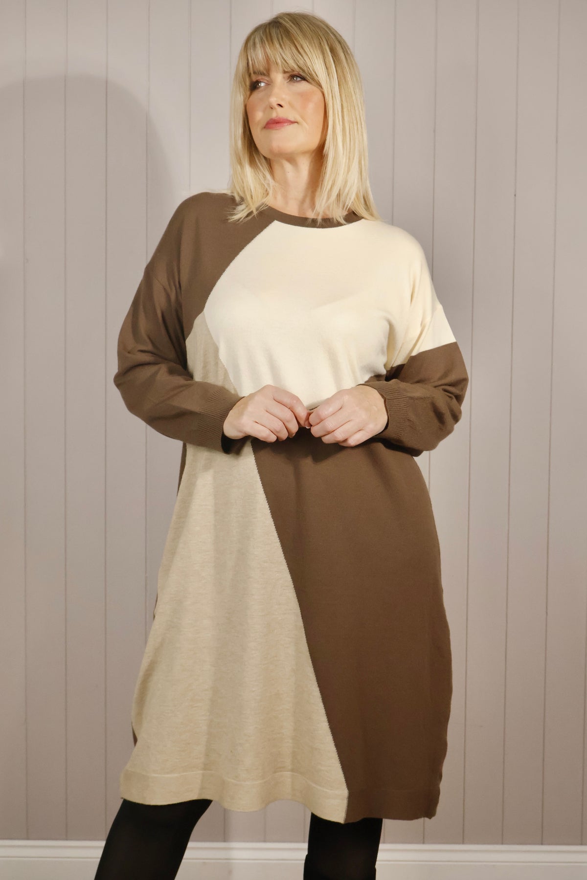 Soft, easy and flattering with a relaxed drape. The colour block panels create shape without clinging, making this a great everyday throw on with boots or trainers. Lightweight stretch knit that hangs beautifully and feels comfy all day.