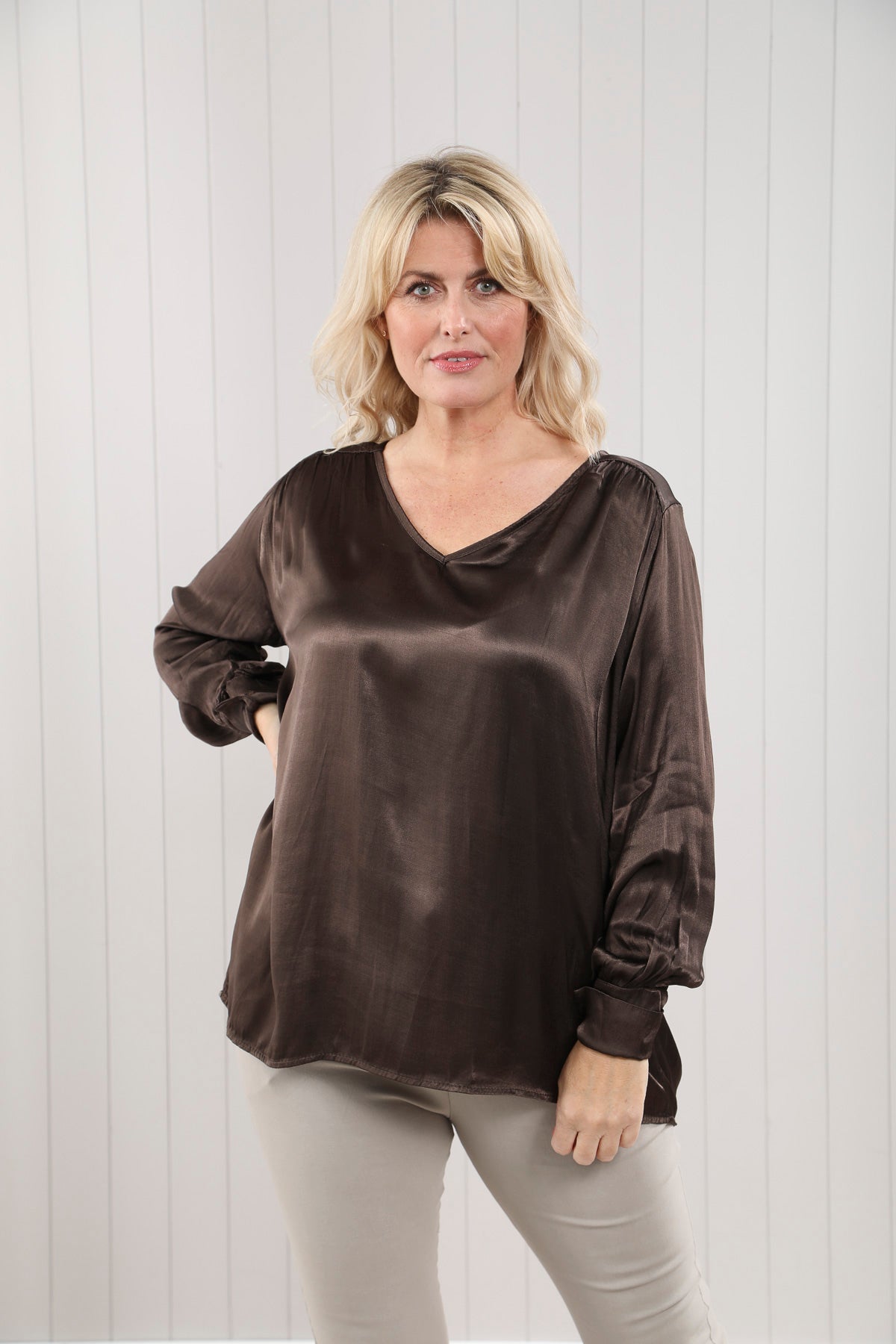 A beautifully fluid blouse with a soft satin-like sheen that drapes effortlessly over the body. Featuring gentle gathering at the shoulders and elegant button cuffs, it’s the perfect piece for dressing up jeans or pairing with wide-leg trousers for evening style.
