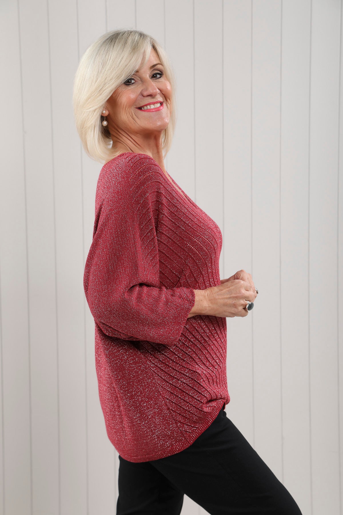 A touch of shimmer with a relaxed drape – this lightweight knit is perfect for dressing up or styling casually. The diagonal rib texture flatters the shape beautifully while the soft V neckline adds elegance. Easy, comfortable and chic.