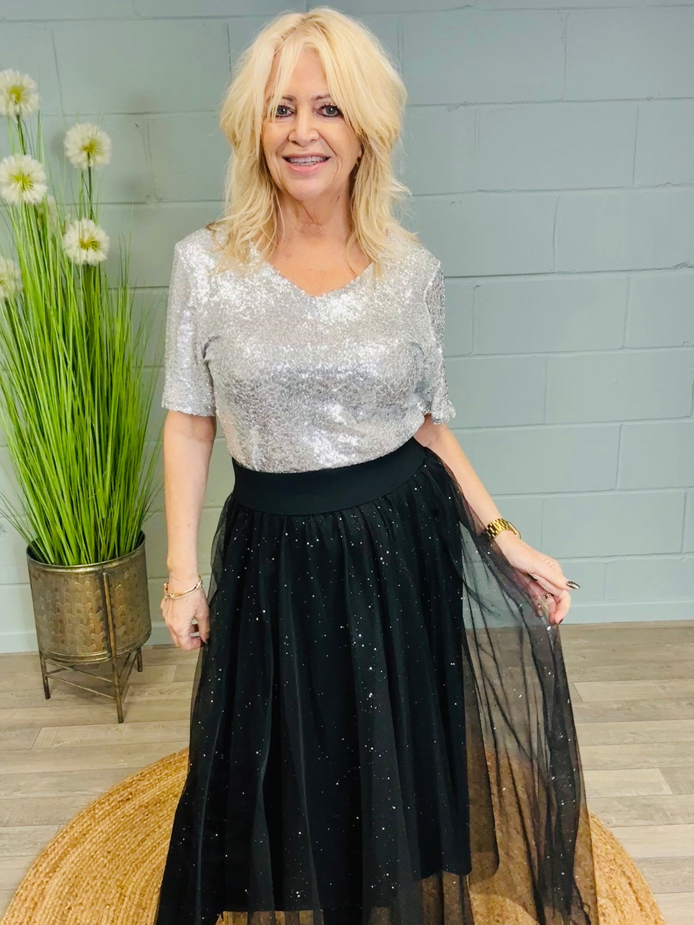 A dreamy shimmer skirt perfect for festive styling, nights out or dressed down with chunky knits and trainers. Featuring a sparkly tulle outer layer with a soft lining underneath floaty, elegant and comfortable with an elasticated waistband.