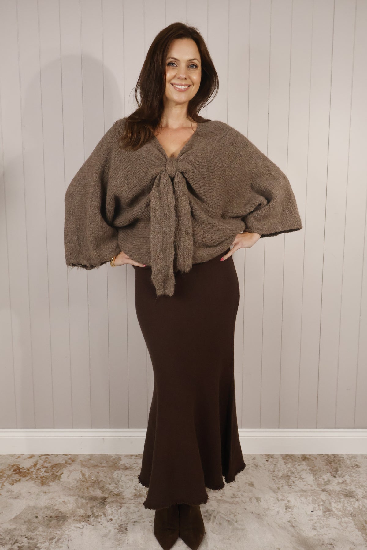 The Delphine skirt is a chic knit piece with a modern twist. Featuring a comfortable elasticated waistband and a flattering midi length, it gently flares out at the bottom for a feminine silhouette. Finished with a subtle fringe hem, it’s the perfect balance of comfort and style. Designed to fit up to a size 12/14, this versatile skirt is available in four timeless shades – beige, wine, chocolate, and black – making it easy to pair with chunky knits, blouses, or blazers for endless outfit options.