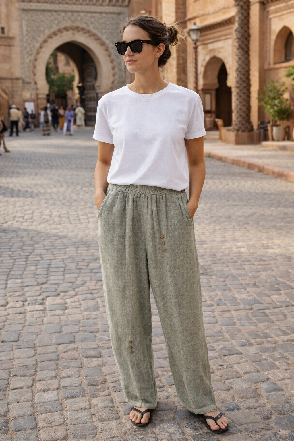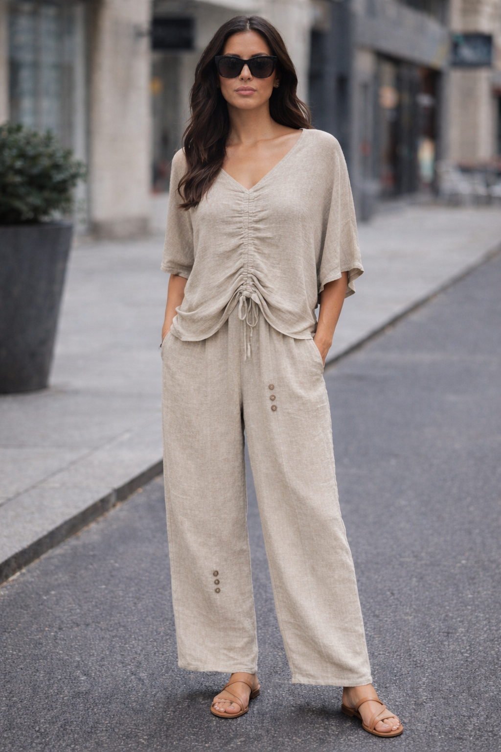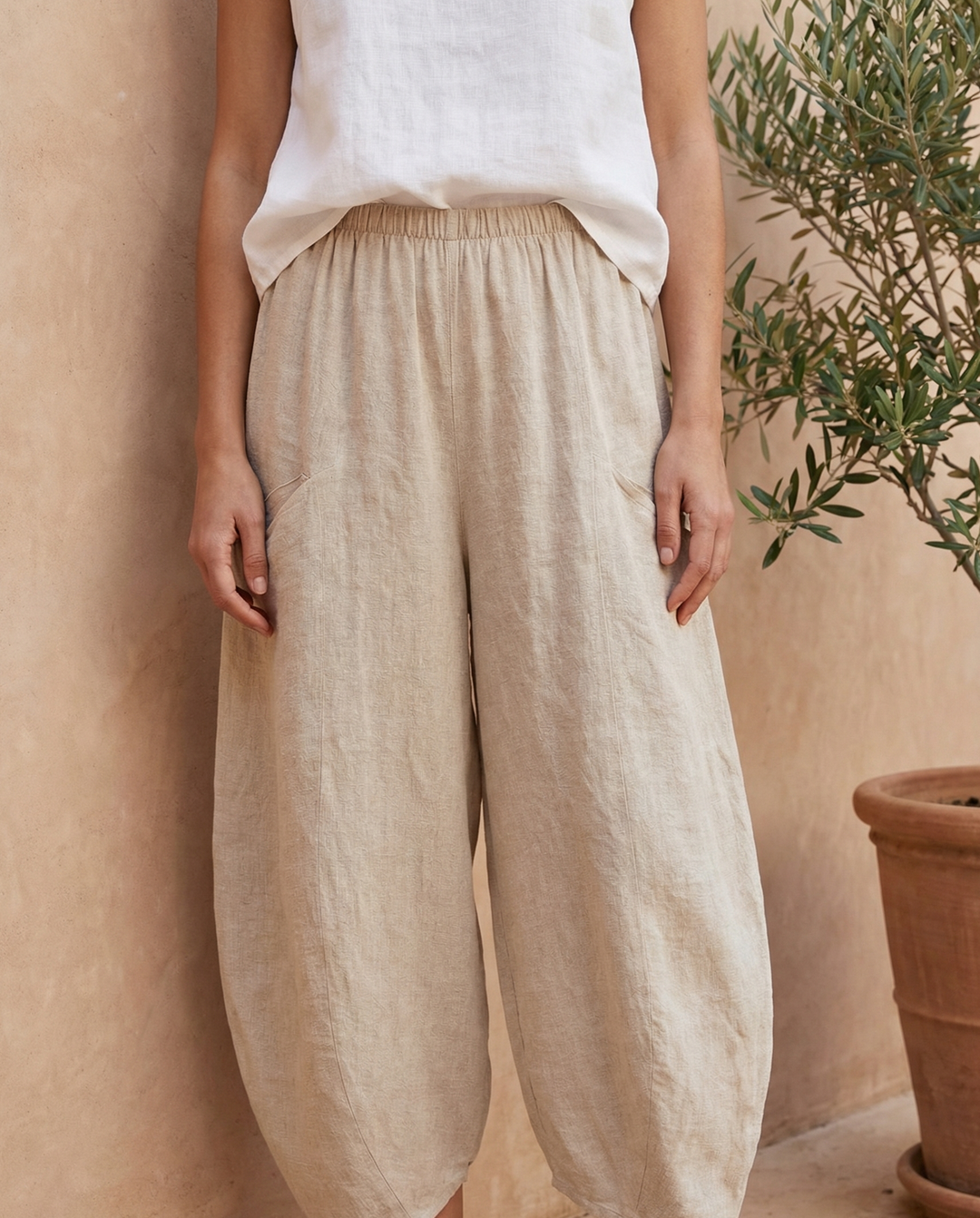 Crafted in breathable linen cotton fabric, with most pieces beautifully stonewashed for a soft, lived-in finish, this collection features easy, slouchy silhouettes in sun faded neutrals, with crisp white as the only clean block colour.