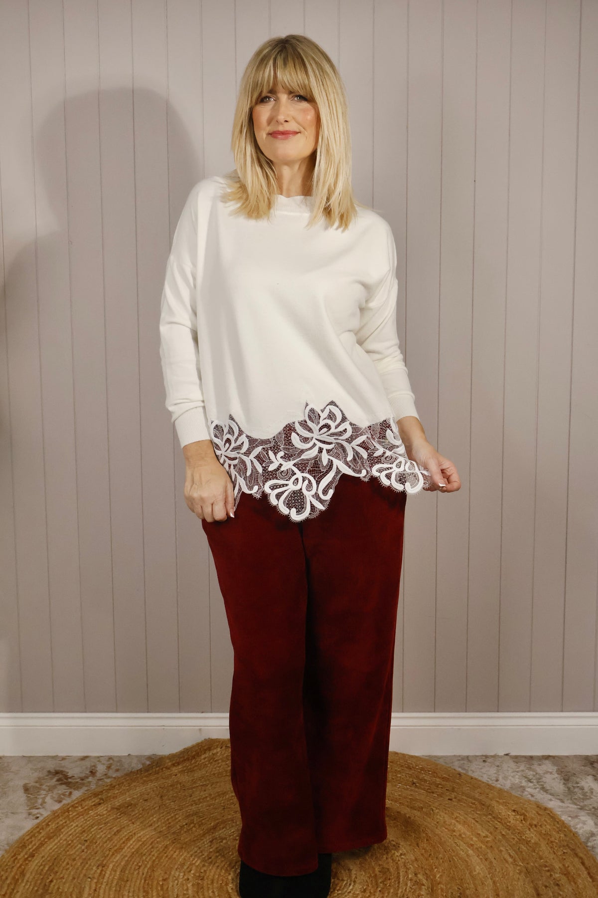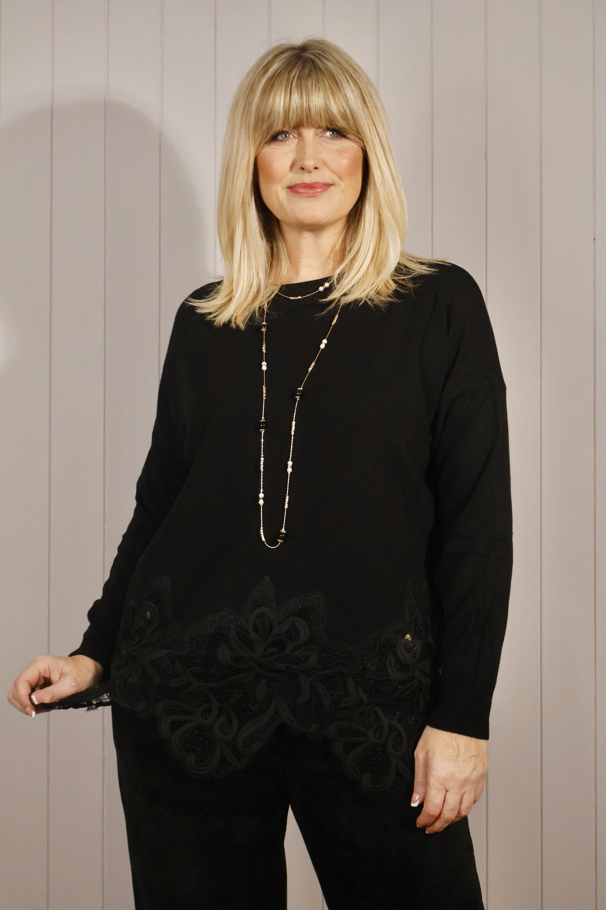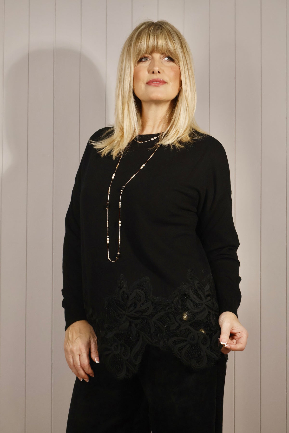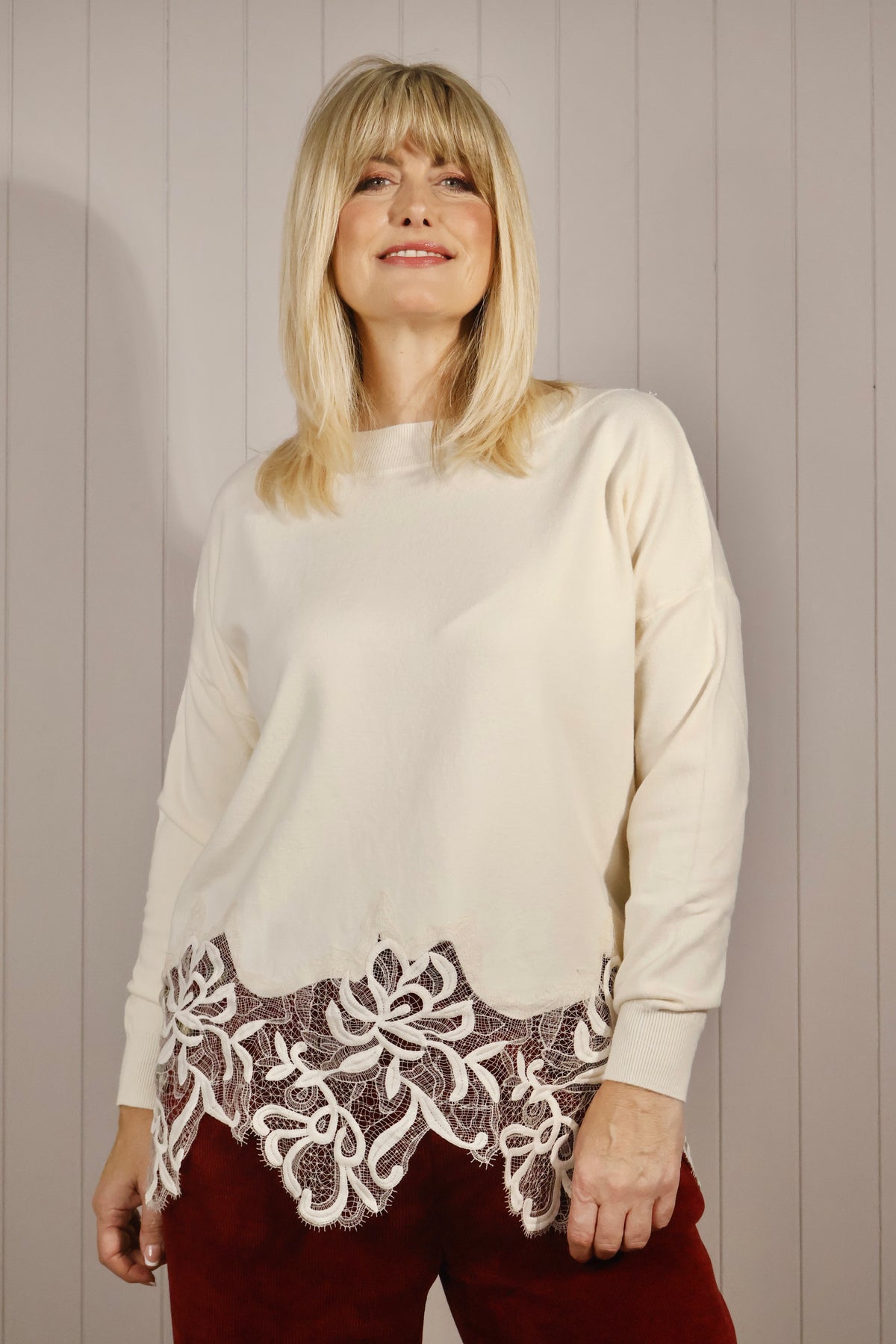 Soft, easy and quietly elegant. The Latina brings a touch of romance with its statement lace hem, adding texture and movement to a beautifully relaxed knit silhouette. An effortless piece that elevates everyday dressing, it works just as well with jeans as it does layered over satin or tailored trousers.