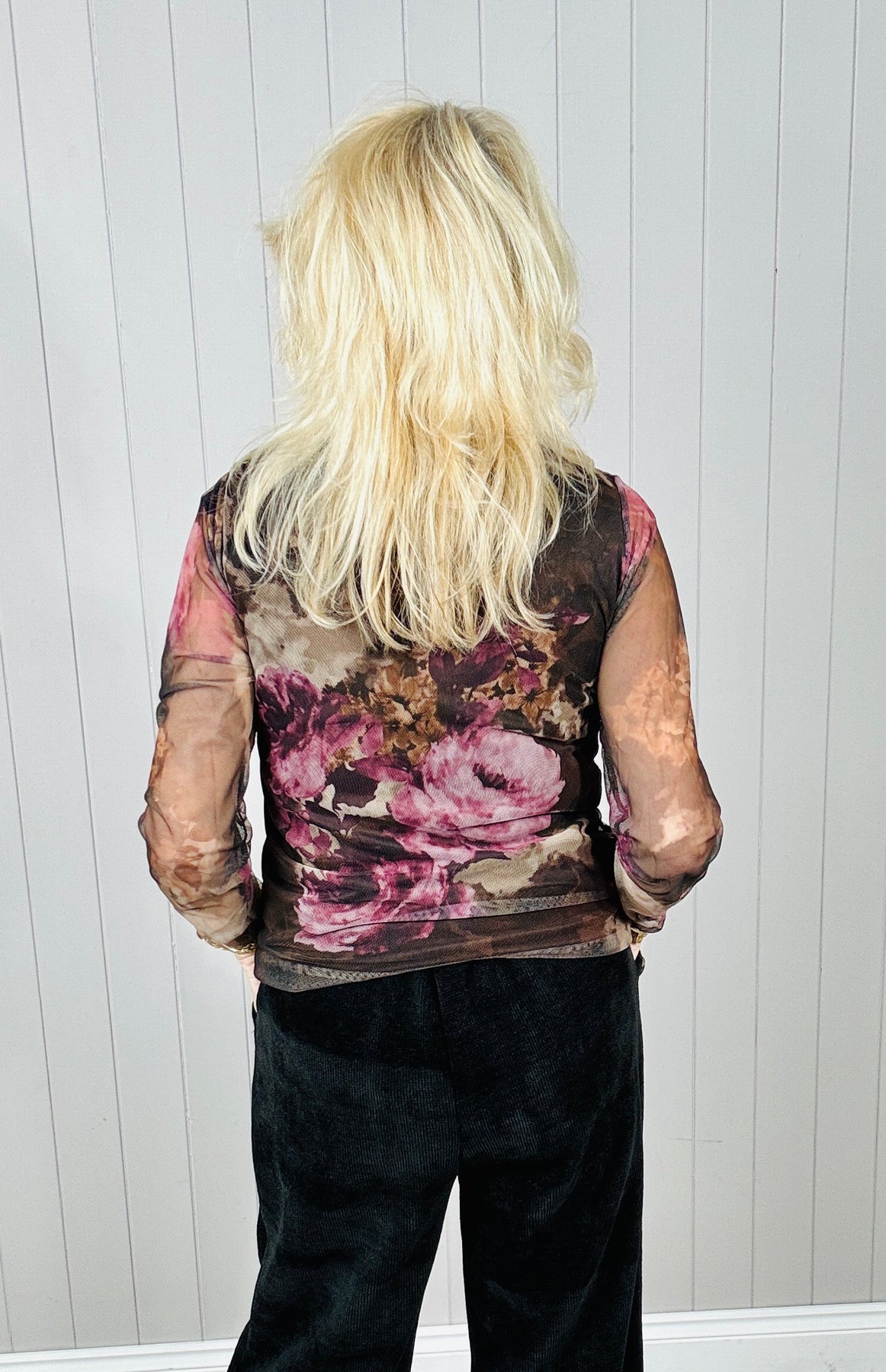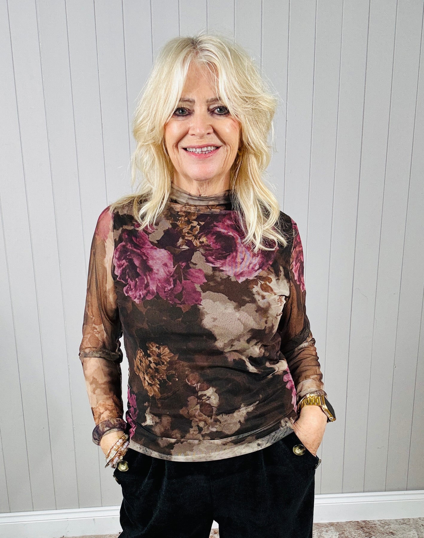 A vintage inspired print top designed with a sheer mesh overlay and a built in cami for easy, confident styling. The draped back detail and lightweight stretch fabric give it a flattering fit that works day to night. Pair with denims or sleek trousers for instant impact, and add a blazer