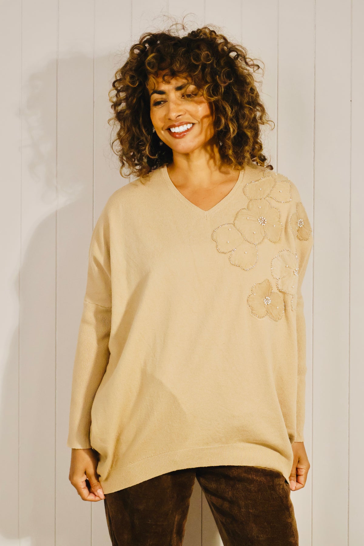 This beautifully soft knit is all about those standout details. The floral appliqué is finished with beads and tiny pearls, giving a subtle shimmer that lifts any outfit. The relaxed drape, dipped back hem and flattering V-neck make it an easy, throw on style you’ll wear again and again.