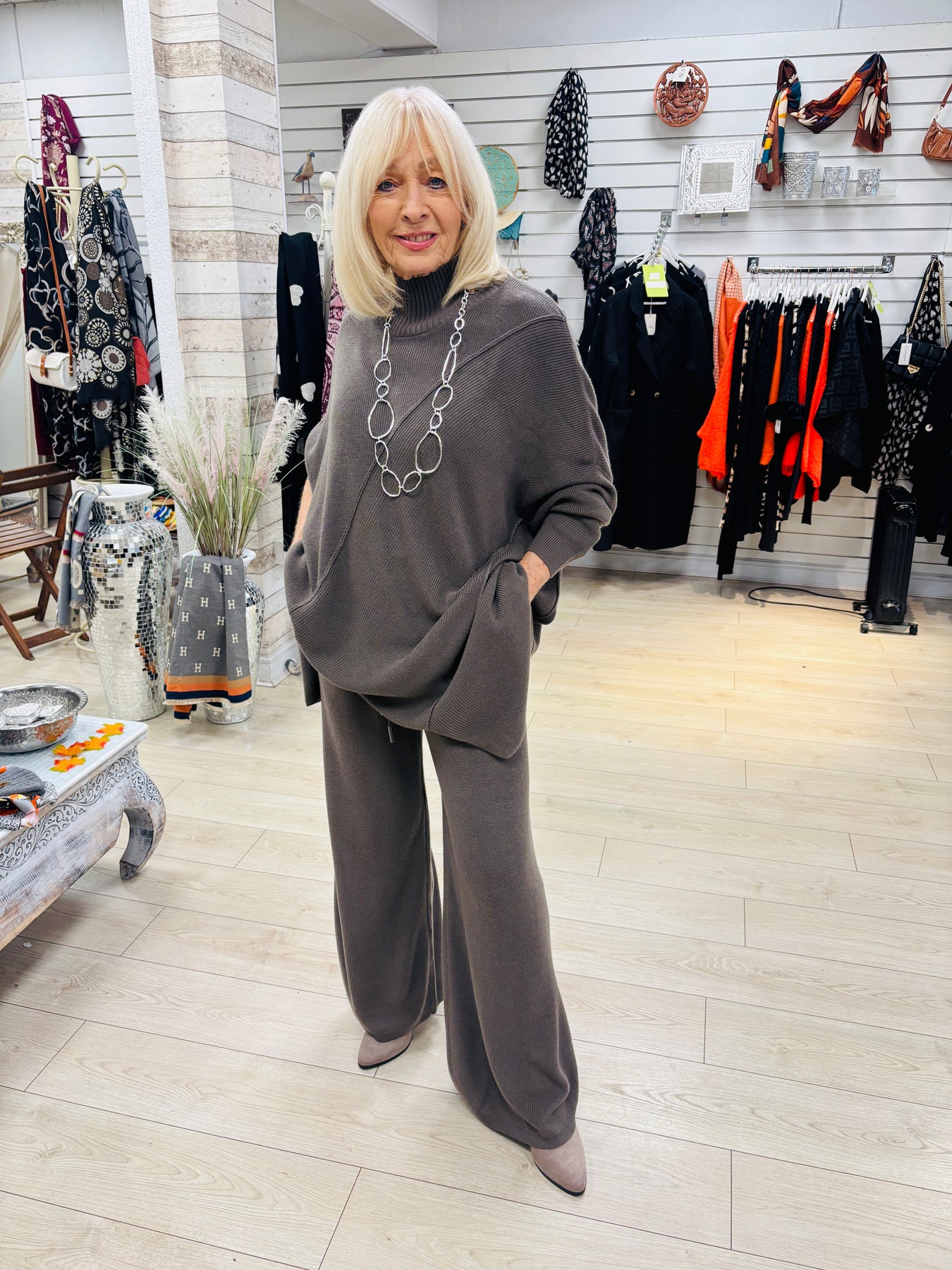 Featuring a relaxed asymmetric top with ribbed detail and wide leg trousers with an elasticated drawstring waist, this is your go anywhere outfit for the cooler season.