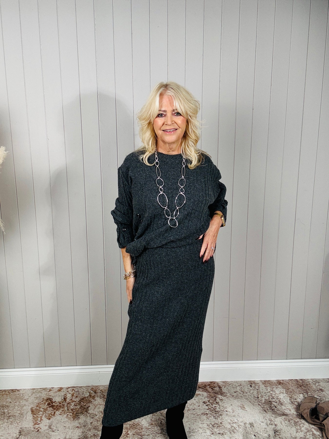 Effortlessly elegant with a modern twist, the Beatrix Co-Ord Set is the perfect blend of comfort and style. This two-piece outfit features a soft ribbed knit skirt with a stretchy elasticated waistband, paired with a matching asymmetric top finished with statement buttons and a tie detail for a flattering silhouette.