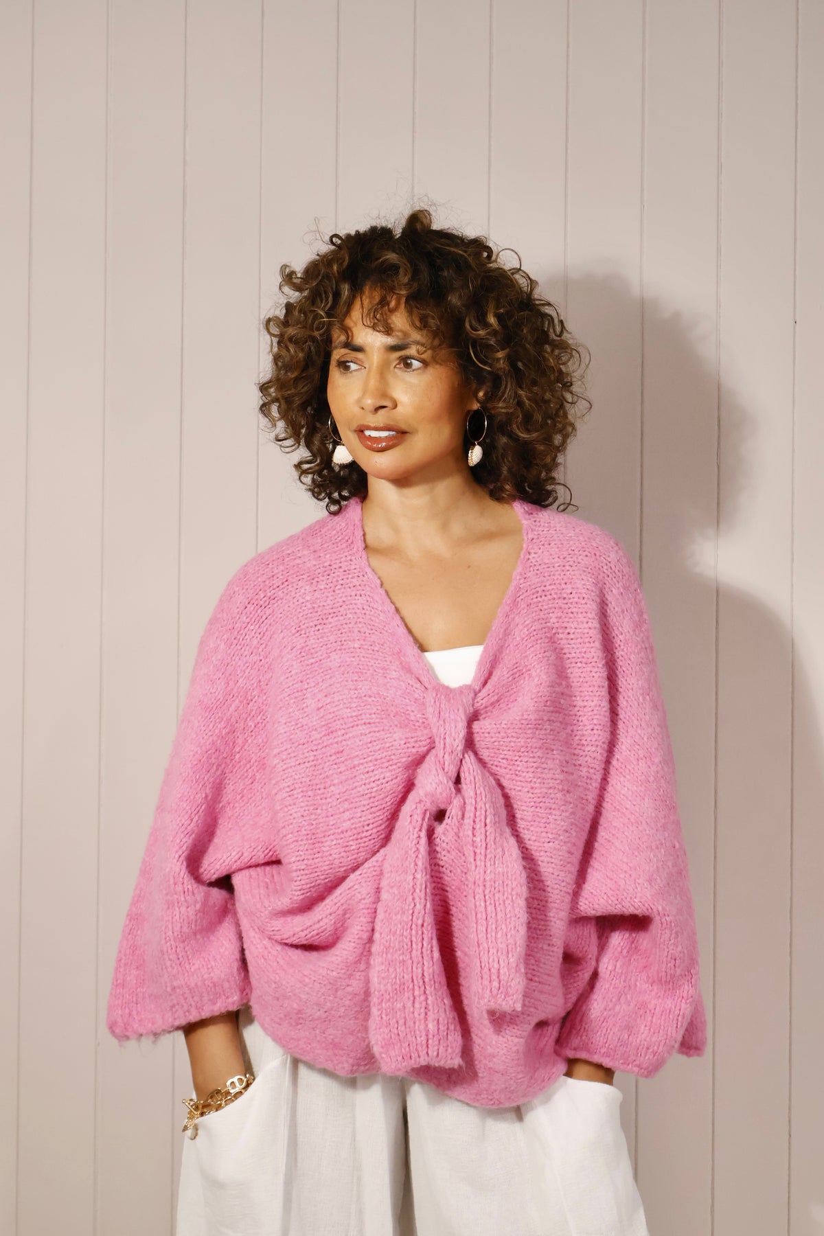 Soft, feminine and effortlessly chic, the Bella Bow Jumper is a wardrobe favourite you’ll reach for again and again. Designed in a flattering rose pink, it features a statement front bow, relaxed fit and draped sleeves for a touch of elegance. Pair it with jeans for everyday ease or match with our Delphine Skirt for a co-ordinated look.