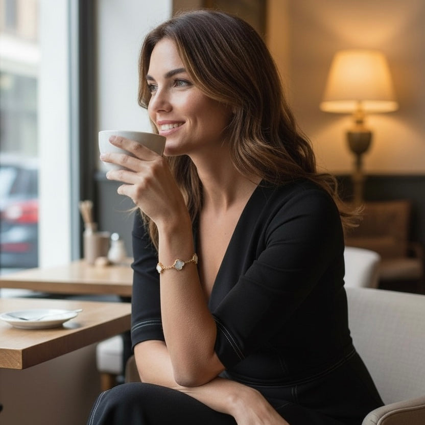 A beautifully elegant bracelet featuring five ivory clover charms set in a gold frame. The soft pearlescent finish catches the light beautifully, creating a refined piece that elevates both everyday and occasion outfits.