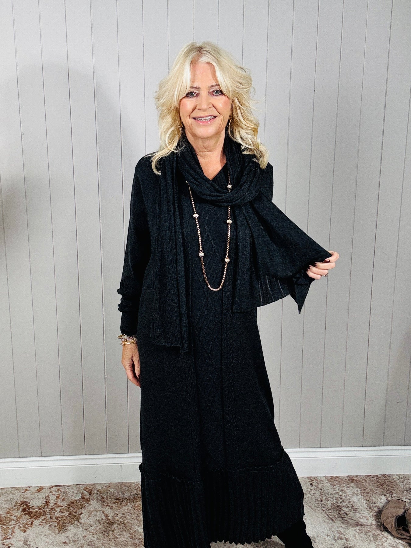 Elevate your everyday style with our Connie Dress a beautifully soft knit design that combines comfort and sophistication. In a dark charcal tone, this longline cable knit dress features subtle textured detailing through the front and a flattering pleated hem. Complete with a matching scarf for a polished layered look.