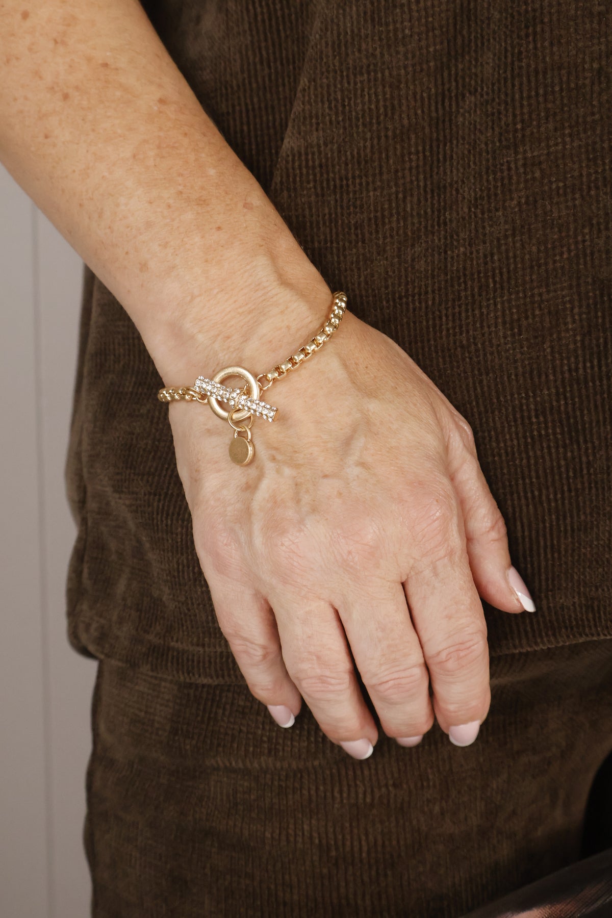 Elegant and effortless, this gold-tone bracelet features a chunky link chain finished with a sparkling diamante T-bar clasp for a touch of luxe. Perfect worn solo or stacked with other pieces for a layered look.
