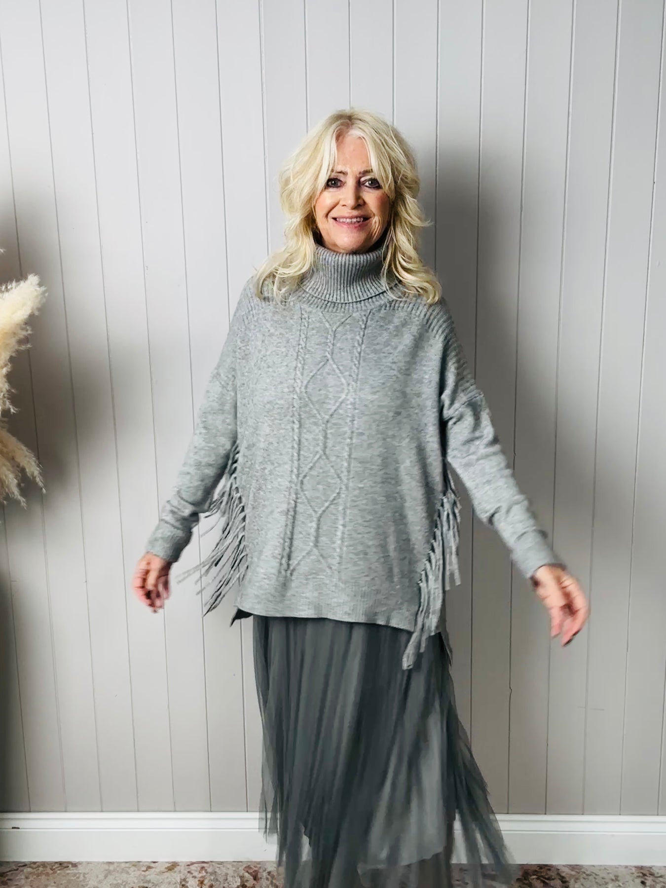 A stunning two-piece set that’s elegant yet easy to wear. The Francesca Set features our signature fringed jumper with soft cable knit detailing through the front, layered over a lightweight pleated dress for that floaty, feminine finish.