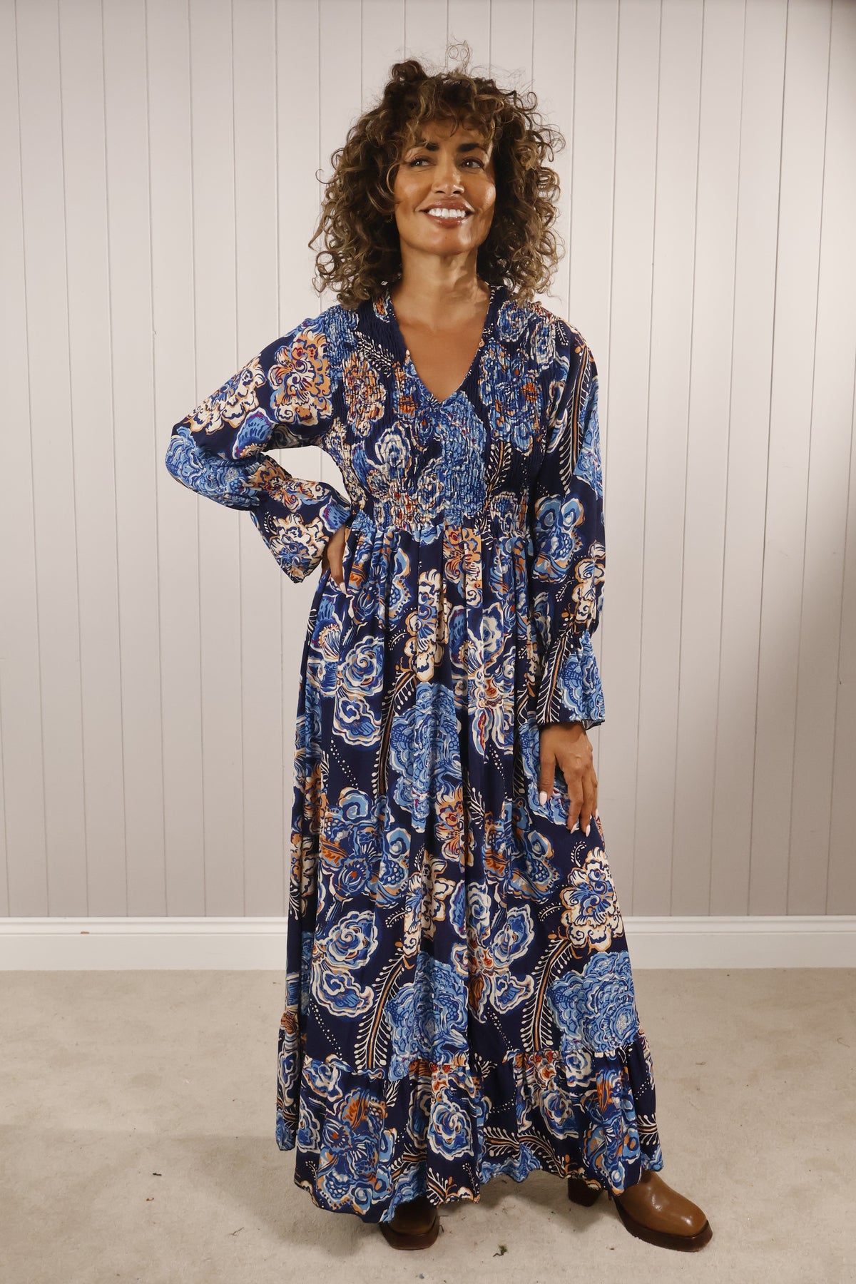 A floaty navy paisley dress with a flattering V neckline and a comfy shirred bodice. Easy to throw on with boots now, then sandals when the sun’s back.