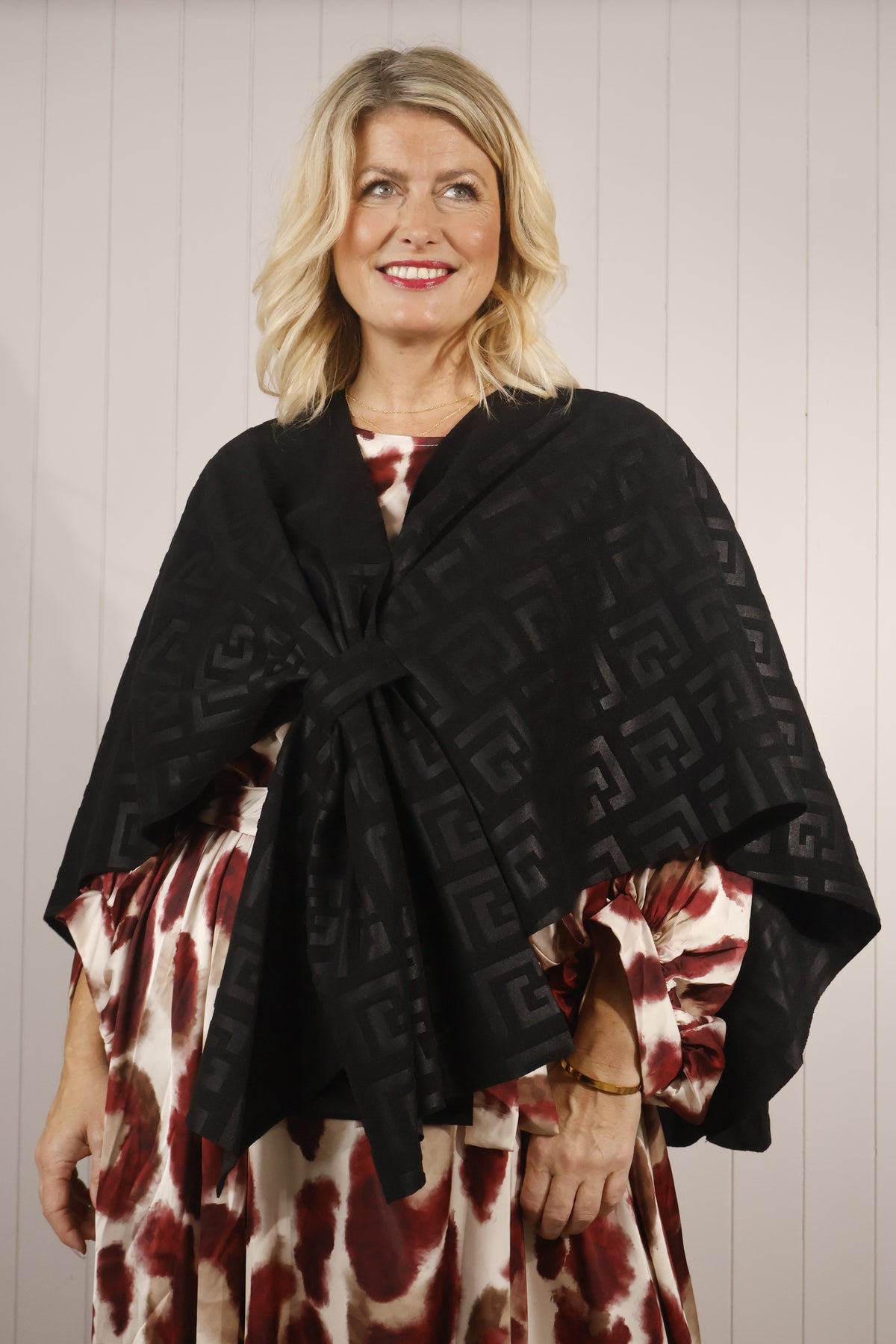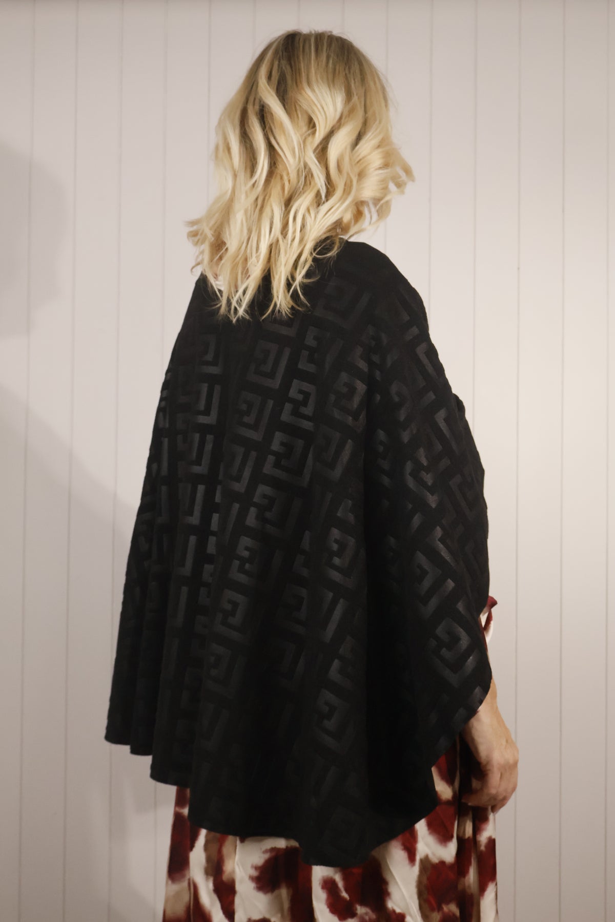 Elevate your layering with the Suzetta Cape, an effortlessly chic Italian design with a striking geometric jacquard pattern. Made from a soft, midweight fabric that drapes beautifully, it features a clever built-in loop detail on one side to secure the fabric through, giving a perfectly styled, pulled together look every time.